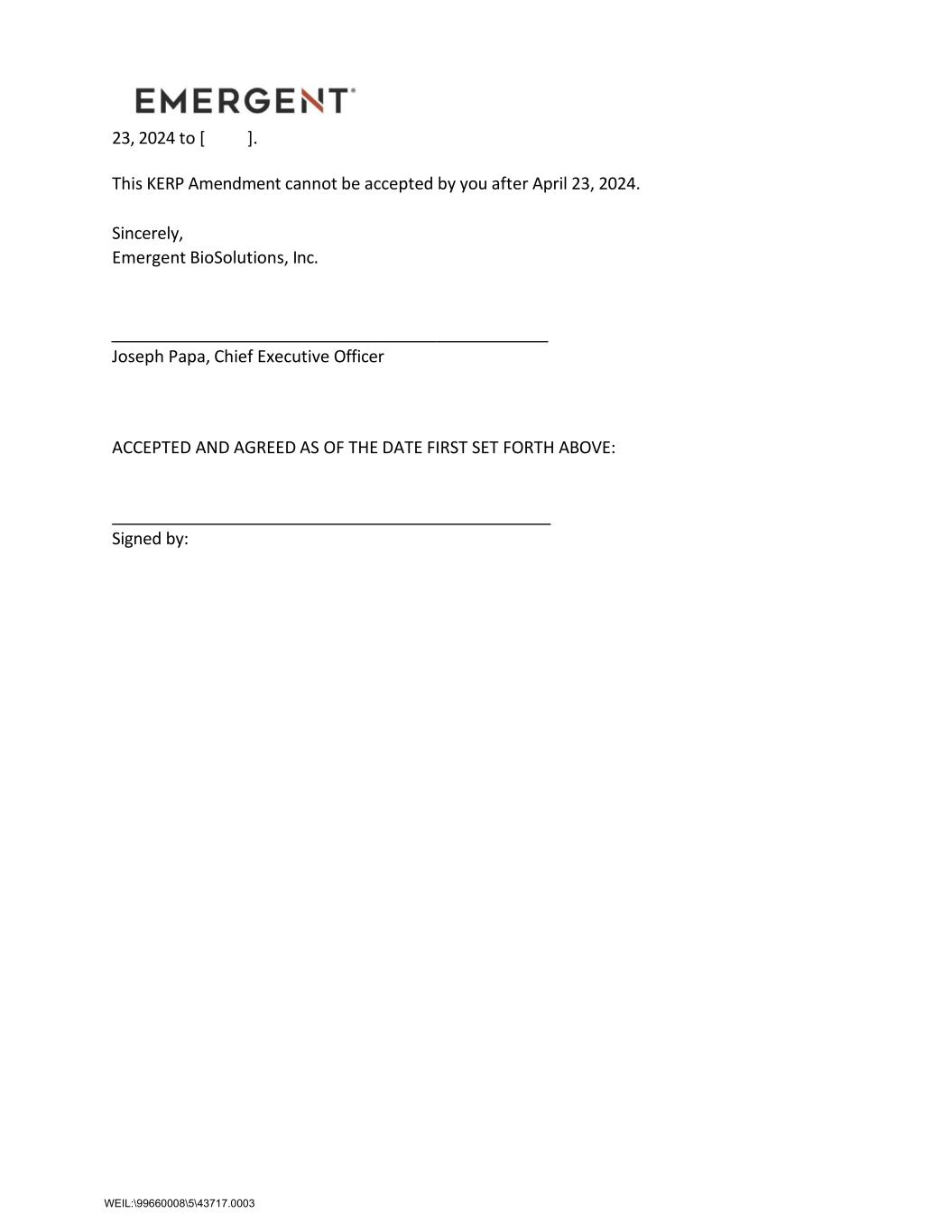 WEIL:\99660008\5\43717.0003 23, 2024 to [ ]. This KERP Amendment cannot be accepted by you after April 23, 2024. Sincerely, Emergent BioSolutions, Inc. Joseph Papa, Chief Executive Officer ACCEPTED AND AGREED AS OF THE DATE FIRST SET FORTH ABOVE: ________________________________________________ Signed by: