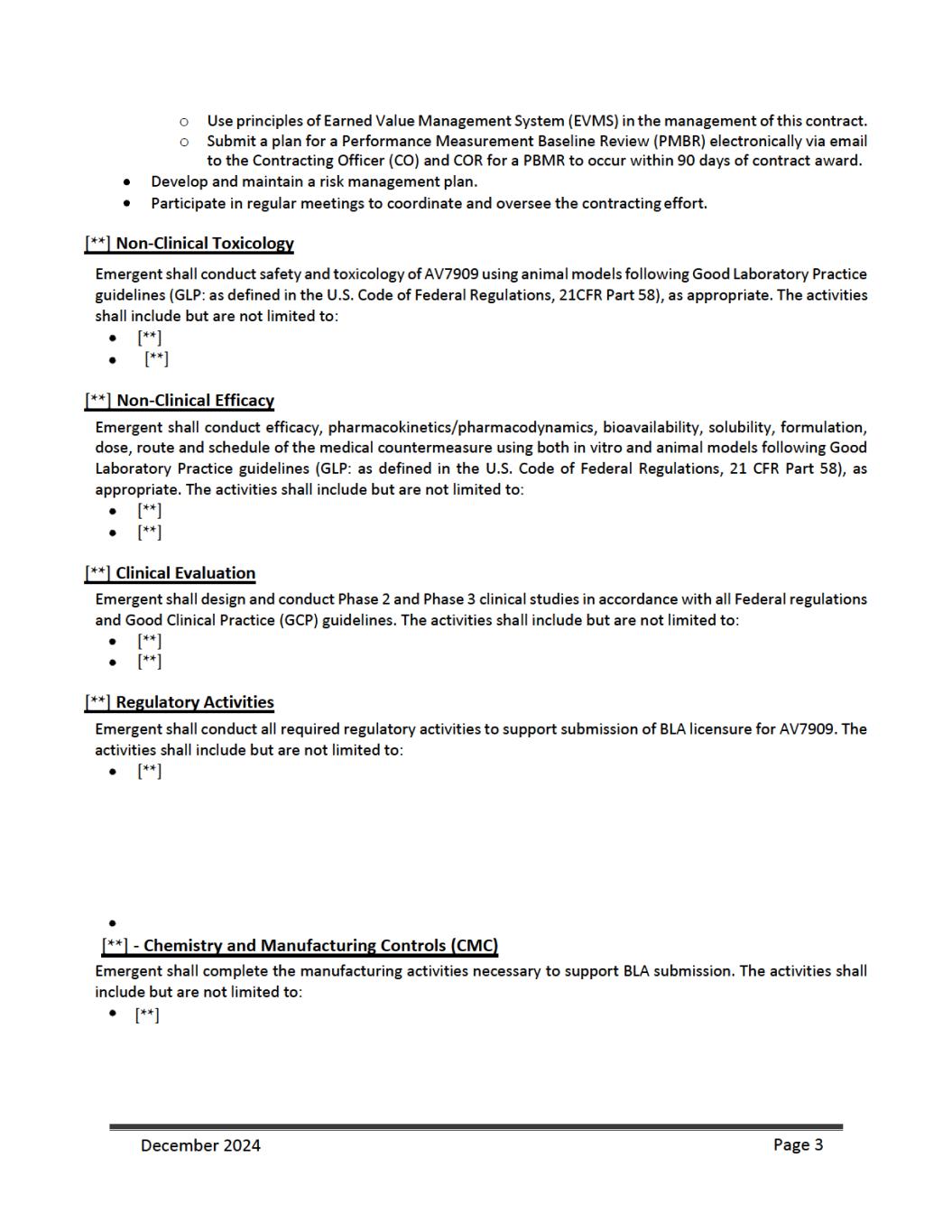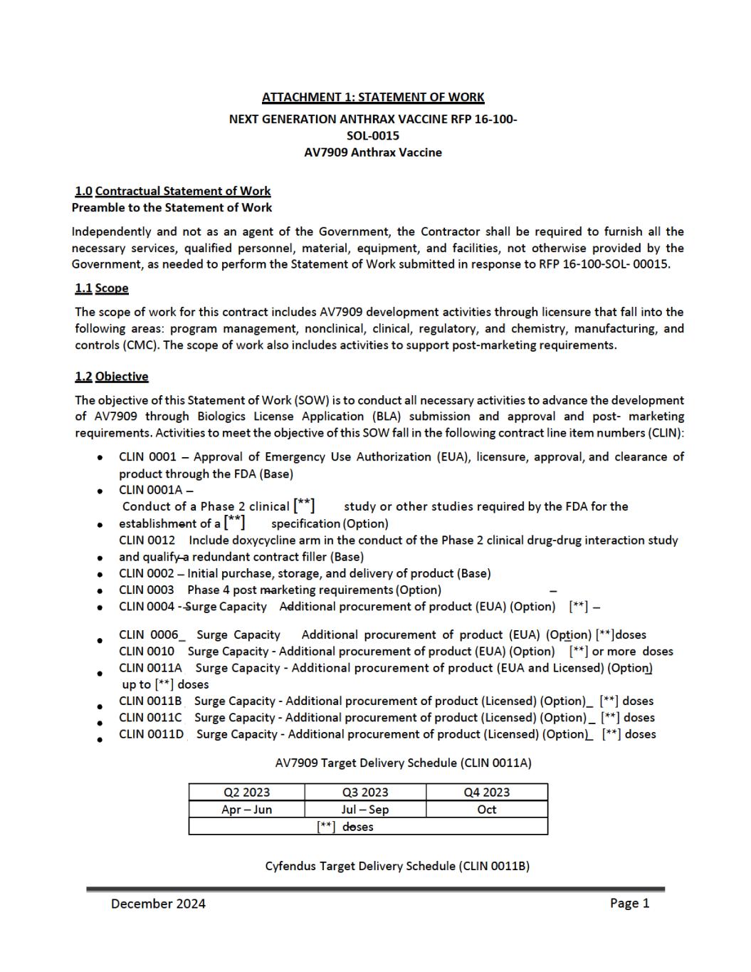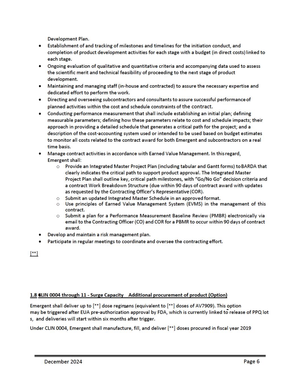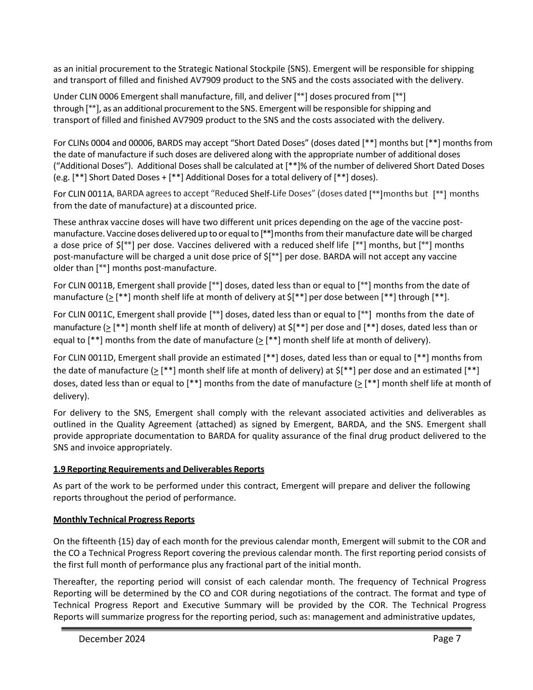 as an initial procurement to the Strategic National Stockpile {SNS). Emergent will be responsible for shipping and transport of filled and finished AV7909 product to the SNS and the costs associated with the delivery. Under CLIN 0006 Emergent shall manufacture, fill, and deliver [**] doses procured from [**] through [**], as an additional procurement to the SNS. Emergent will be responsible for shipping and transport of filled and finished AV7909 product to the SNS and the costs associated with the delivery. For CLINs 0004 and 00006, BARDS may accept “Short Dated Doses” (doses dated [**] months but [**] months from the date of manufacture if such doses are delivered along with the appropriate number of additional doses (“Additional Doses”). Additional Doses shall be calculated at [**]% of the number of delivered Short Dated Doses (e.g. [**] Short Dated Doses + [**] Additional Doses for a total delivery of [**] doses). For CLIN 0011A ed Shelf- [**] [**] from the date of manufacture) at a discounted price. These anthrax vaccine doses will have two different unit prices depending on the age of the vaccine post- manufacture. Vaccine doses delivered up to or equal to [**] months from their manufacture date will be charged a dose price of $[**] per dose. Vaccines delivered with a reduced shelf life [**] months, but [**] months post-manufacture will be charged a unit dose price of $[**] per dose. BARDA will not accept any vaccine older than [**] months post-manufacture. For CLIN 0011B, Emergent shall provide [**] doses, dated less than or equal to [**] months from the date of manufacture (> [**] month shelf life at month of delivery at $[**] per dose between [**] through [**]. For CLIN 0011C, Emergent shall provide [**] doses, dated less than or equal to [**] months from the date of manufacture (> [**] month shelf life at month of delivery) at $[**] per dose and [**] doses, dated less than or equal to [**] months from the date of manufacture (> [**] month shelf life at month of delivery). For CLIN 0011D, Emergent shall provide an estimated [**] doses, dated less than or equal to [**] months from the date of manufacture (> [**] month shelf life at month of delivery) at $[**] per dose and an estimated [**] doses, dated less than or equal to [**] months from the date of manufacture (> [**] month shelf life at month of delivery). For delivery to the SNS, Emergent shall comply with the relevant associated activities and deliverables as outlined in the Quality Agreement {attached) as signed by Emergent, BARDA, and the SNS. Emergent shall provide appropriate documentation to BARDA for quality assurance of the final drug product delivered to the SNS and invoice appropriately. 1.9 Reporting Requirements and Deliverables Reports As part of the work to be performed under this contract, Emergent will prepare and deliver the following reports throughout the period of performance. Monthly Technical Progress Reports On the fifteenth {15) day of each month for the previous calendar month, Emergent will submit to the COR and the CO a Technical Progress Report covering the previous calendar month. The first reporting period consists of the first full month of performance plus any fractional part of the initial month. Thereafter, the reporting period will consist of each calendar month. The frequency of Technical Progress Reporting will be determined by the CO and COR during negotiations of the contract. The format and type of Technical Progress Report and Executive Summary will be provided by the COR. The Technical Progress Reports will summarize progress for the reporting period, such as: management and administrative updates, December 2024 Page 7