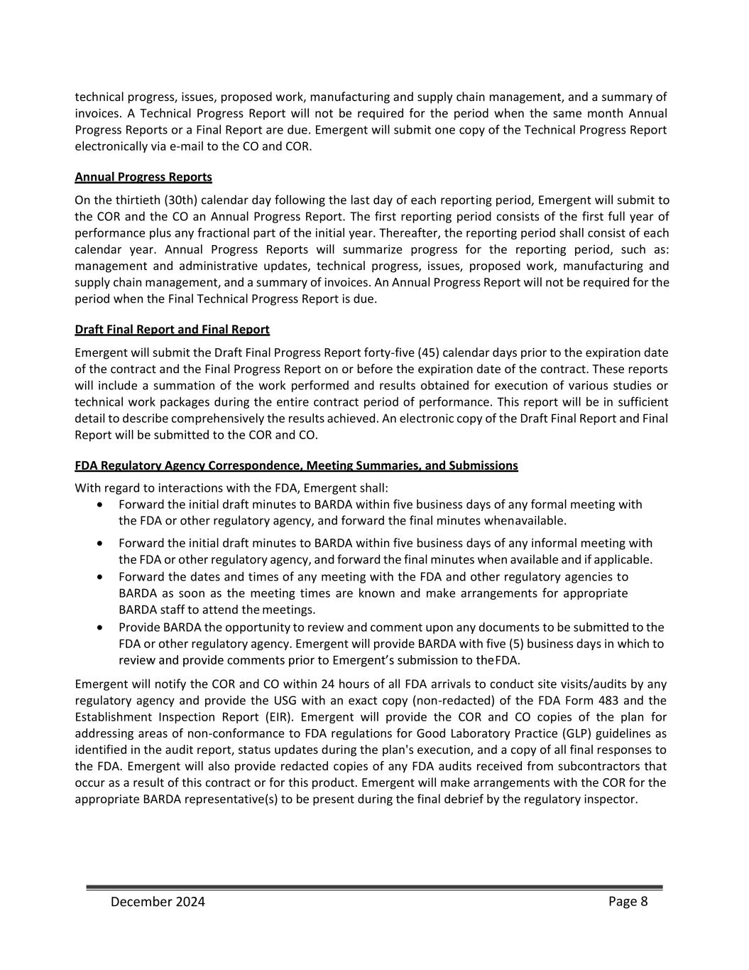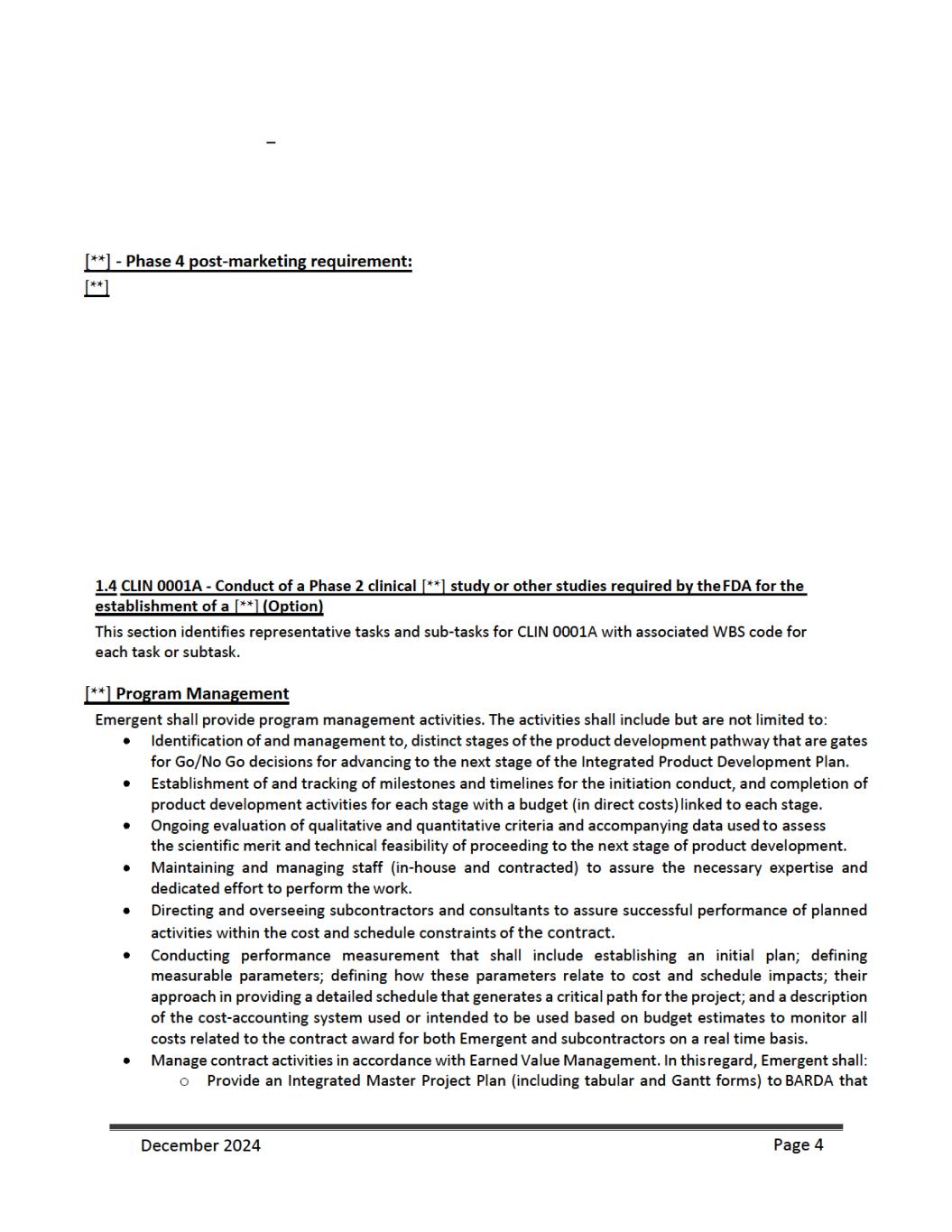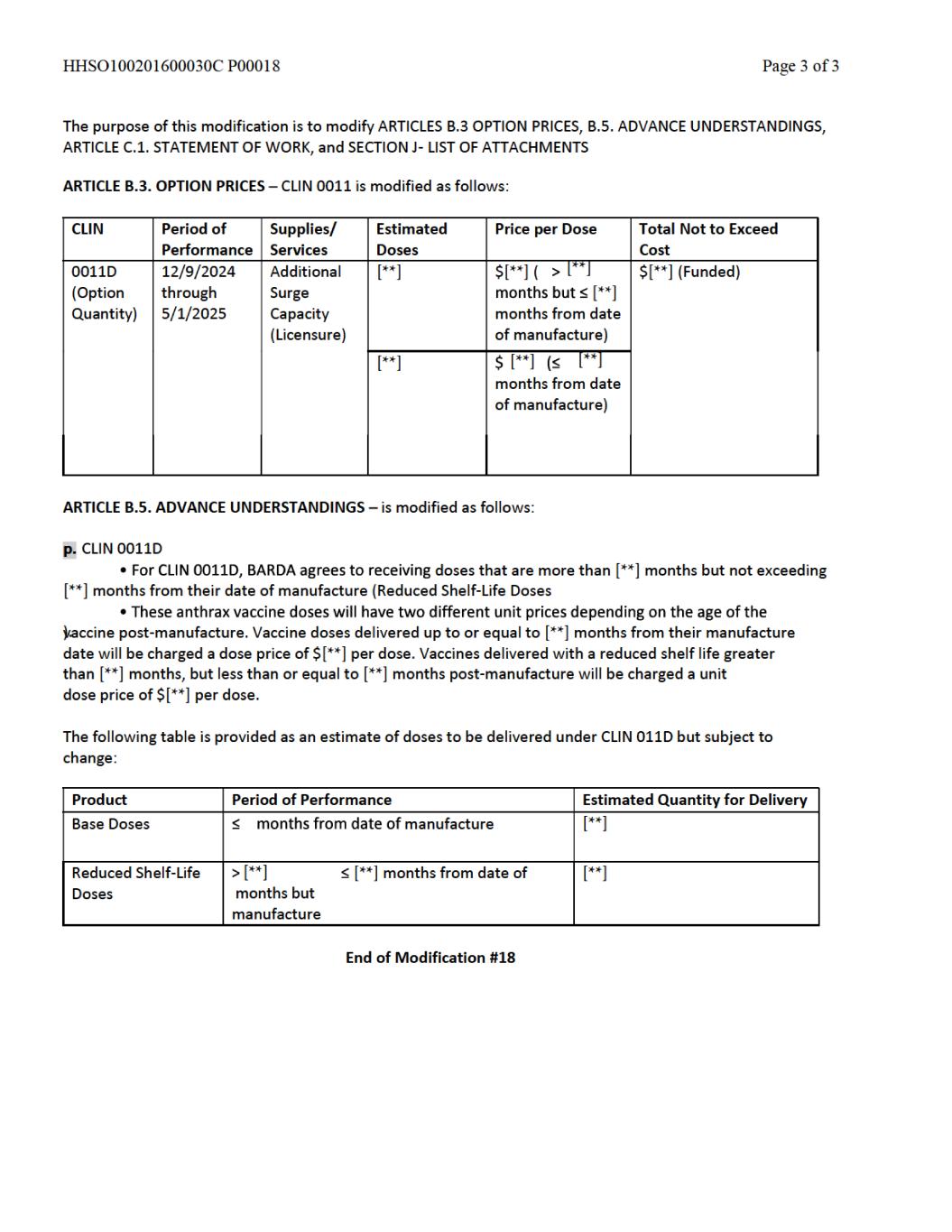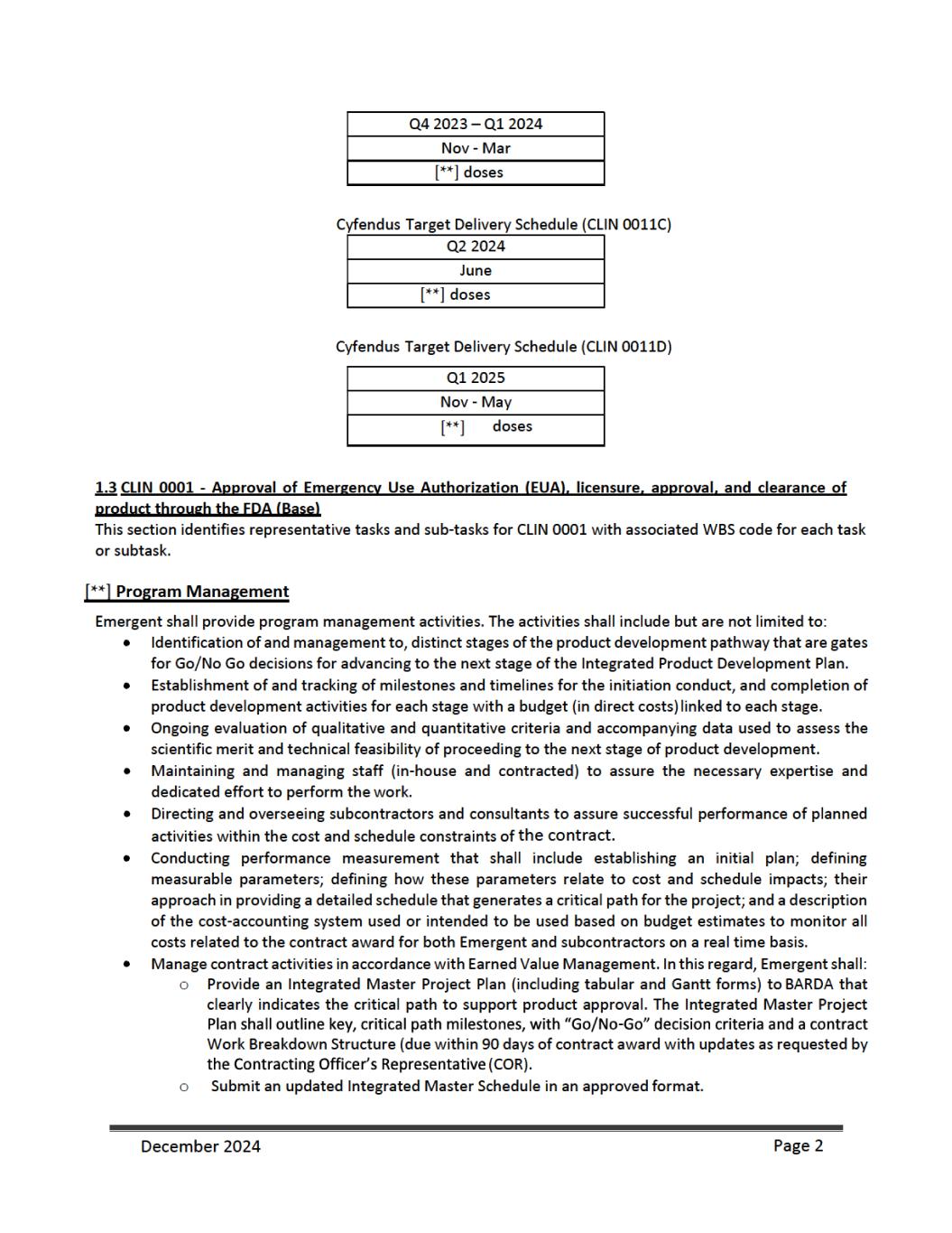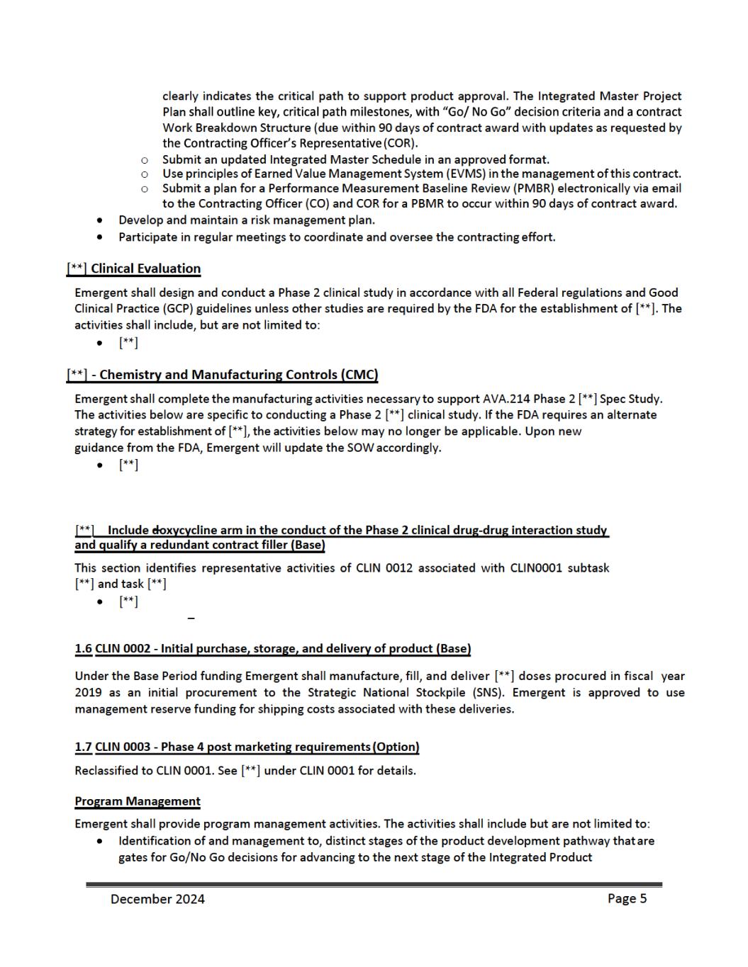 as an initial procurement to the Strategic National Stockpile {SNS). Emergent will be responsible for shipping and transport of filled and finished AV7909 product to the SNS and the costs associated with the delivery. Under CLIN 0006 Emergent shall manufacture, fill, and deliver [**] doses procured from [**] through [**], as an additional procurement to the SNS. Emergent will be responsible for shipping and transport of filled and finished AV7909 product to the SNS and the costs associated with the delivery. For CLINs 0004 and 00006, BARDS may accept “Short Dated Doses” (doses dated [**] months but [**] months from the date of manufacture if such doses are delivered along with the appropriate number of additional doses (“Additional Doses”). Additional Doses shall be calculated at [**]% of the number of delivered Short Dated Doses (e.g. [**] Short Dated Doses + [**] Additional Doses for a total delivery of [**] doses). For CLIN 0011A ed Shelf- [**] [**] from the date of manufacture) at a discounted price. These anthrax vaccine doses will have two different unit prices depending on the age of the vaccine post- manufacture. Vaccine doses delivered up to or equal to [**] months from their manufacture date will be charged a dose price of $[**] per dose. Vaccines delivered with a reduced shelf life [**] months, but [**] months post-manufacture will be charged a unit dose price of $[**] per dose. BARDA will not accept any vaccine older than [**] months post-manufacture. For CLIN 0011B, Emergent shall provide [**] doses, dated less than or equal to [**] months from the date of manufacture (> [**] month shelf life at month of delivery at $[**] per dose between [**] through [**]. For CLIN 0011C, Emergent shall provide [**] doses, dated less than or equal to [**] months from the date of manufacture (> [**] month shelf life at month of delivery) at $[**] per dose and [**] doses, dated less than or equal to [**] months from the date of manufacture (> [**] month shelf life at month of delivery). For CLIN 0011D, Emergent shall provide an estimated [**] doses, dated less than or equal to [**] months from the date of manufacture (> [**] month shelf life at month of delivery) at $[**] per dose and an estimated [**] doses, dated less than or equal to [**] months from the date of manufacture (> [**] month shelf life at month of delivery). For delivery to the SNS, Emergent shall comply with the relevant associated activities and deliverables as outlined in the Quality Agreement {attached) as signed by Emergent, BARDA, and the SNS. Emergent shall provide appropriate documentation to BARDA for quality assurance of the final drug product delivered to the SNS and invoice appropriately. 1.9 Reporting Requirements and Deliverables Reports As part of the work to be performed under this contract, Emergent will prepare and deliver the following reports throughout the period of performance. Monthly Technical Progress Reports On the fifteenth {15) day of each month for the previous calendar month, Emergent will submit to the COR and the CO a Technical Progress Report covering the previous calendar month. The first reporting period consists of the first full month of performance plus any fractional part of the initial month. Thereafter, the reporting period will consist of each calendar month. The frequency of Technical Progress Reporting will be determined by the CO and COR during negotiations of the contract. The format and type of Technical Progress Report and Executive Summary will be provided by the COR. The Technical Progress Reports will summarize progress for the reporting period, such as: management and administrative updates, December 2024 Page 7