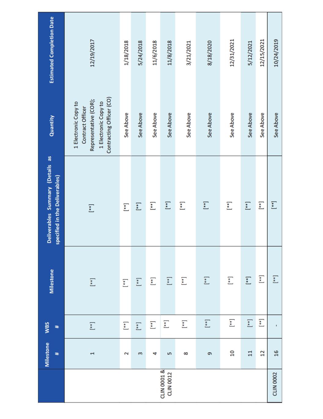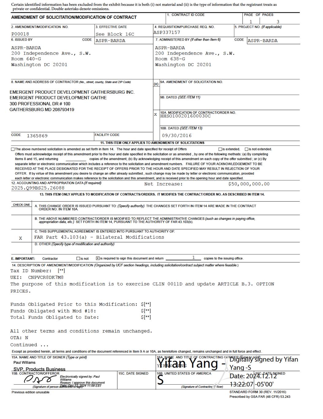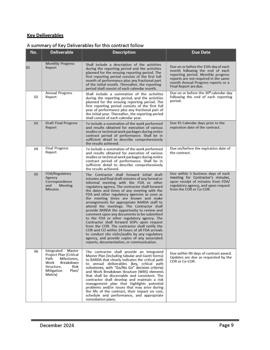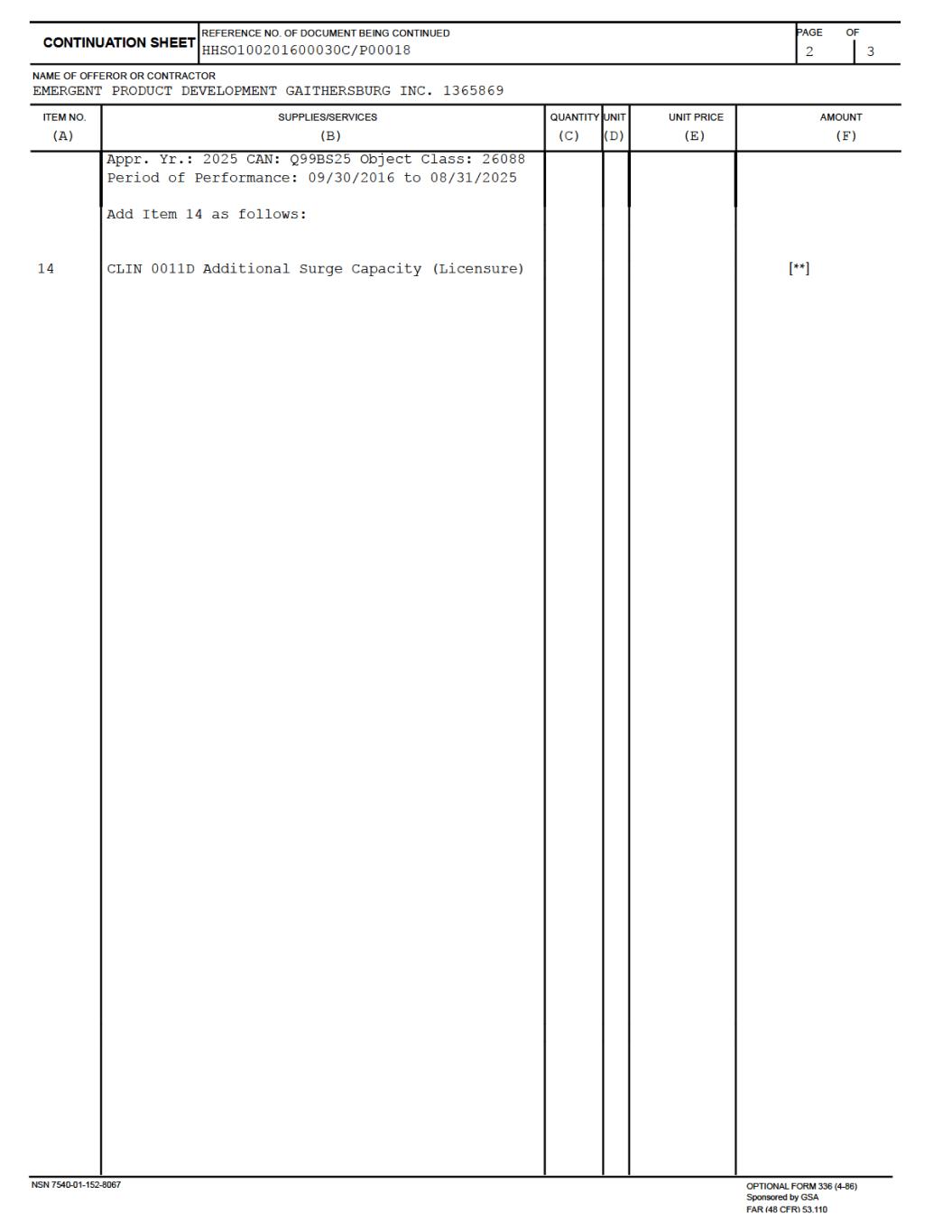 as an initial procurement to the Strategic National Stockpile {SNS). Emergent will be responsible for shipping and transport of filled and finished AV7909 product to the SNS and the costs associated with the delivery. Under CLIN 0006 Emergent shall manufacture, fill, and deliver [**] doses procured from [**] through [**], as an additional procurement to the SNS. Emergent will be responsible for shipping and transport of filled and finished AV7909 product to the SNS and the costs associated with the delivery. For CLINs 0004 and 00006, BARDS may accept “Short Dated Doses” (doses dated [**] months but [**] months from the date of manufacture if such doses are delivered along with the appropriate number of additional doses (“Additional Doses”). Additional Doses shall be calculated at [**]% of the number of delivered Short Dated Doses (e.g. [**] Short Dated Doses + [**] Additional Doses for a total delivery of [**] doses). For CLIN 0011A ed Shelf- [**] [**] from the date of manufacture) at a discounted price. These anthrax vaccine doses will have two different unit prices depending on the age of the vaccine post- manufacture. Vaccine doses delivered up to or equal to [**] months from their manufacture date will be charged a dose price of $[**] per dose. Vaccines delivered with a reduced shelf life [**] months, but [**] months post-manufacture will be charged a unit dose price of $[**] per dose. BARDA will not accept any vaccine older than [**] months post-manufacture. For CLIN 0011B, Emergent shall provide [**] doses, dated less than or equal to [**] months from the date of manufacture (> [**] month shelf life at month of delivery at $[**] per dose between [**] through [**]. For CLIN 0011C, Emergent shall provide [**] doses, dated less than or equal to [**] months from the date of manufacture (> [**] month shelf life at month of delivery) at $[**] per dose and [**] doses, dated less than or equal to [**] months from the date of manufacture (> [**] month shelf life at month of delivery). For CLIN 0011D, Emergent shall provide an estimated [**] doses, dated less than or equal to [**] months from the date of manufacture (> [**] month shelf life at month of delivery) at $[**] per dose and an estimated [**] doses, dated less than or equal to [**] months from the date of manufacture (> [**] month shelf life at month of delivery). For delivery to the SNS, Emergent shall comply with the relevant associated activities and deliverables as outlined in the Quality Agreement {attached) as signed by Emergent, BARDA, and the SNS. Emergent shall provide appropriate documentation to BARDA for quality assurance of the final drug product delivered to the SNS and invoice appropriately. 1.9 Reporting Requirements and Deliverables Reports As part of the work to be performed under this contract, Emergent will prepare and deliver the following reports throughout the period of performance. Monthly Technical Progress Reports On the fifteenth {15) day of each month for the previous calendar month, Emergent will submit to the COR and the CO a Technical Progress Report covering the previous calendar month. The first reporting period consists of the first full month of performance plus any fractional part of the initial month. Thereafter, the reporting period will consist of each calendar month. The frequency of Technical Progress Reporting will be determined by the CO and COR during negotiations of the contract. The format and type of Technical Progress Report and Executive Summary will be provided by the COR. The Technical Progress Reports will summarize progress for the reporting period, such as: management and administrative updates, December 2024 Page 7