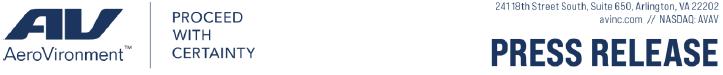 AeroVironment (NASDAQ: AVAV) provides technology solutions at the intersection of robotics, sensors, software analytics and connectivity that deliver more actionable intelligence so you can Proceed with Certainty. Headquartered in Virginia, AeroVironment is a global leader in intelligent, multi-domain robotic systems, and serves defense, government and commercial customers. For more information, visit www.avinc.com.