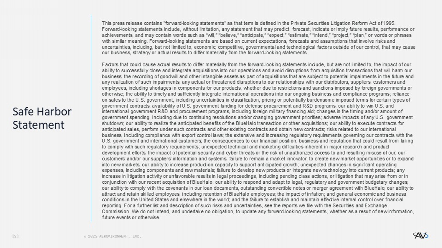 © 2025 AEROVIRONMENT, INC. [ 2 ] Safe Harbor Statement This press release contains "forward - looking statements" as that term is defined in the Private Securities Litigation Reform Act of 1995. Forward - looking statements include, without limitation, any statement that may predict, forecast, indicate or imply future resul ts, performance or achievements, and may contain words such as “will,” “believe,” “anticipate,” “expect,” “estimate,” “intend,” “project,” “plan ,” or words or phrases with similar meaning. Forward - looking statements are based on current expectations, forecasts and assumptions that involve risks and uncertainties, including, but not limited to, economic, competitive, governmental and technological factors outside of our co ntr ol, that may cause our business, strategy or actual results to differ materially from the forward - looking statements. Factors that could cause actual results to differ materially from the forward - looking statements include, but are not limited to , the impact of our ability to successfully close and integrate acquisitions into our operations and avoid disruptions from acquisition transacti ons that will harm our business; the recording of goodwill and other intangible assets as part of acquisitions that are subject to potential impairm ent s in the future and any realization of such impairments; any actual or threatened disruptions to our relationships with our distributors, supplie rs, customers and employees, including shortages in components for our products, whether due to restrictions and sanctions imposed by foreign g ove rnments or otherwise; the ability to timely and sufficiently integrate international operations into our ongoing business and compliance pr ograms; reliance on sales to the U.S. government, including uncertainties in classification, pricing or potentially burdensome imposed terms f or certain types of government contracts; availability of U.S. government funding for defense procurement and R&D programs; our ability to win U. S. and international government R&D and procurement programs, including foreign military financing aid; changes in the timing and/or am ount of government spending, including due to continuing resolutions and/or changing government priorities; adverse impacts of any U. S. government shutdown; our ability to realize the anticipated benefits of the BlueHalo transaction or other acquisitions; our ability to execute contracts for anticipated sales, perform under such contracts and other existing contracts and obtain new contracts; risks related to our i nte rnational business, including compliance with export control laws; the extensive and increasing regulatory requirements governing our c ont racts with the U.S. government and international customers; the consequences to our financial position, business and reputation that could r esu lt from failing to comply with such regulatory requirements; unexpected technical and marketing difficulties inherent in major research and p rod uct development efforts; the impact of potential security and cyber threats or the risk of unauthorized access to and resulting m isu se of our, our customers’ and/or our suppliers’ information and systems; failure to remain a market innovator, to create new market opportun iti es or to expand into new markets; our ability to increase production capacity to support anticipated growth; unexpected changes in significan t o perating expenses, including components and raw materials; failure to develop new products or integrate new technology into current pr odu cts; any increase in litigation activity or unfavorable results in legal proceedings, including pending class actions, or litigation t hat may arise from or in conjunction with our recent acquisition of BlueHalo ; our ability to respond and adapt to legal, regulatory and government budgetary changes; our ability to comply with the covenants in our loan documents, outstanding convertible notes or merger agreement with BlueHalo ; our ability to attract and retain skilled employees, including retention of BlueHalo employees; the impact of inflation; and general economic and business conditions in the United States and elsewhere in the world; and the failure to establish and maintain effective internal cont rol over financial reporting. For a further list and description of such risks and uncertainties, see the reports we file with the Securities an d E xchange Commission. We do not intend, and undertake no obligation, to update any forward - looking statements, whether as a result of new information, future events or otherwise.