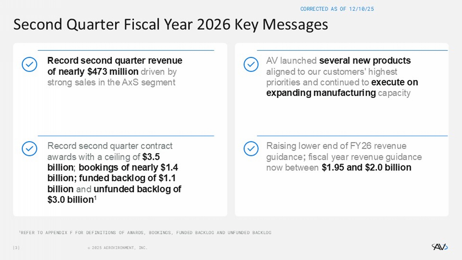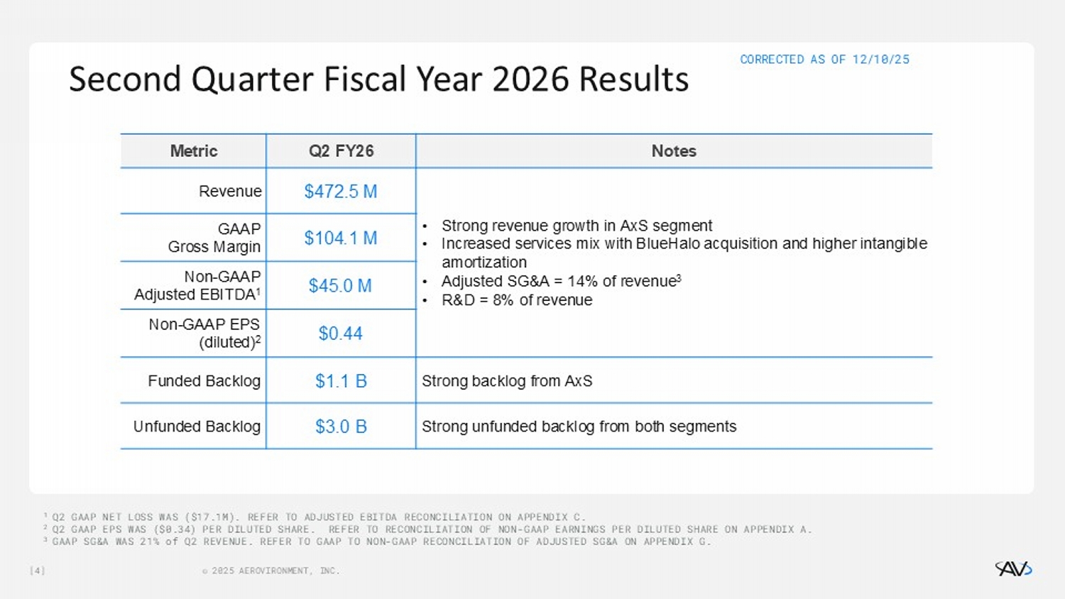 © 2025 AEROVIRONMENT, INC. [ 3 ] AV launched several new products aligned to our customers' highest priorities and continued to execute on expanding manufacturing capacity Record second quarter revenue of nearly $473 million driven by strong sales in the AxS segment Raising lower end of FY26 revenue guidance ; fiscal year revenue guidance now between $1.95 and $2.0 billion Record second quarter contract awards with a ceiling of $3.5 billion ; bookings of nearly $1.4 billion; funded backlog of $1.1 billion and unfunded backlog of $3.0 billion 1 Second Quarter Fiscal Year 2026 Key Messages 1 REFER TO APPENDIX F FOR DEFINITIONS OF AWARDS, BOOKINGS, FUNDED BACKLOG AND UNFUNDED BACKLOG CORRECTED AS OF 12/10/25