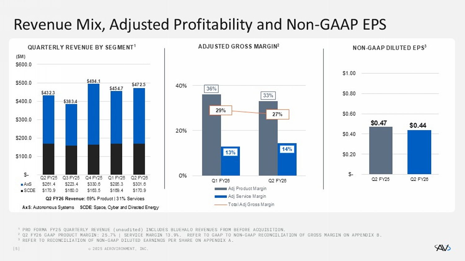 © 2025 AEROVIRONMENT, INC. [ 4 ] Second Quarter Fiscal Year 2026 Results 1 Q2 GAAP NET LOSS WAS ($17.1M). REFER TO ADJUSTED EBITDA RECONCILIATION ON APPENDIX C . 2 Q2 GAAP EPS WAS ($ 0.34 ) PER DILUTED SHARE. REFER TO RECONCILIATION OF NON - GAAP EARNINGS PER DILUTED SHARE ON APPENDIX A. 3 GAAP SG&A WAS 21% of Q2 REVENUE. REFER TO GAAP TO NON - GAAP RECONCILIATION OF ADJUSTED SG&A ON APP ENDIX G. Notes Q2 FY26 Metric • Strong revenue growth in AxS segment • Increased services mix with BlueHalo acquisition and higher intangible amortization • Adjusted SG&A = 14% of revenue 3 • R&D = 8% of revenue $ 472.5 M Revenue $104.1 M GAAP Gross Margin $45.0 M Non - GAAP Adjusted EBITDA 1 $0.44 Non - GAAP EPS (diluted) 2 Strong backlog from AxS $1.1 B Funded Backlog Strong unfunded backlog from both segments $3.0 B Unfunded Backlog CORRECTED AS OF 12/10/25