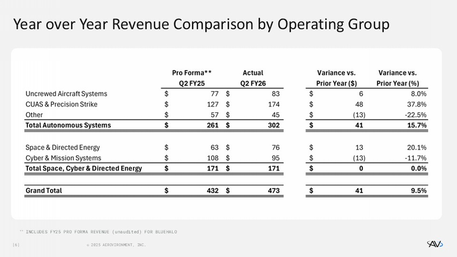 © 2025 AEROVIRONMENT, INC. [ 5 ] $- $100.0 $200.0 $300.0 $400.0 $500.0 $600.0 Q2 FY25 Q3 FY25 Q4 FY25 Q1 FY26 Q2 FY26 AxS $261.4 $223.4 $330.6 $285.3 $301.6 SCDE $170.9 $160.0 $163.5 $169.4 $170.9 $383.4 $472.5 $454.7 $432.3 $ 494.1 Revenue Mix, Adjusted Profitability and Non - GAAP EPS 1 PRO FORMA FY25 QUARTERLY REVENUE (unaudited) INCLUDES BLUEHALO REVENUES FROM BEFORE ACQUISITION. 2 Q2 FY26 GAAP PRODUCT MARGIN: 25.7% | SERVICE MARGIN 13.9%. REFER TO GAAP TO NON - GAAP RECONCILIATION OF GROSS MARGIN ON APPENDI X B. 3 REFER TO RECONCILIATION OF NON - GAAP DILUTED EARNINGS PER SHARE ON APPENDIX A. QUARTERLY REVENUE BY SEGMENT 1 AxS : Autonomous Systems SCDE : Space, Cyber and Directed Energy 36% 33% 13% 14% 29% 27% 0% 20% 40% Q1 FY26 Q2 FY26 Adj Product Margin Adj Service Margin Total Adj Gross Margin $ 0.47 $ 0.44 $- $0.20 $0.40 $0.60 $0.80 $1.00 Q2 FY25 Q2 FY26 NON - GAAP DILUTED EPS 3 Q2 FY26 Revenue: 69% Product | 31% Services ($M) ADJUSTED GROSS MARGIN 2