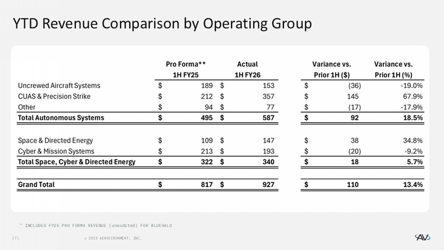 © 2025 AEROVIRONMENT, INC. [ 6 ] Year over Year Revenue Comparison by Operating Group ** INCLUDES FY25 PRO FORMA REVENUE (unaudited) FOR BLUEHALO
