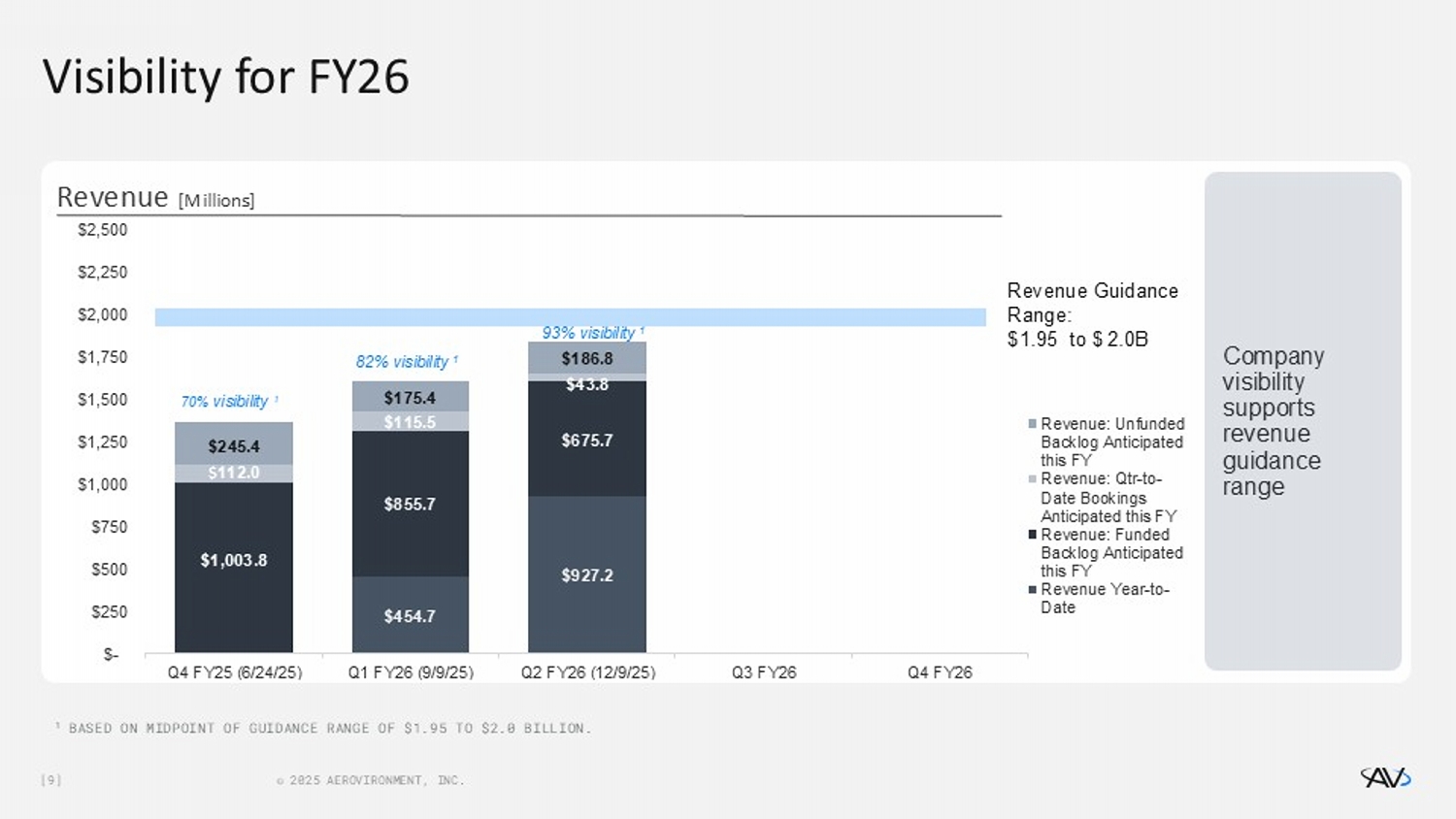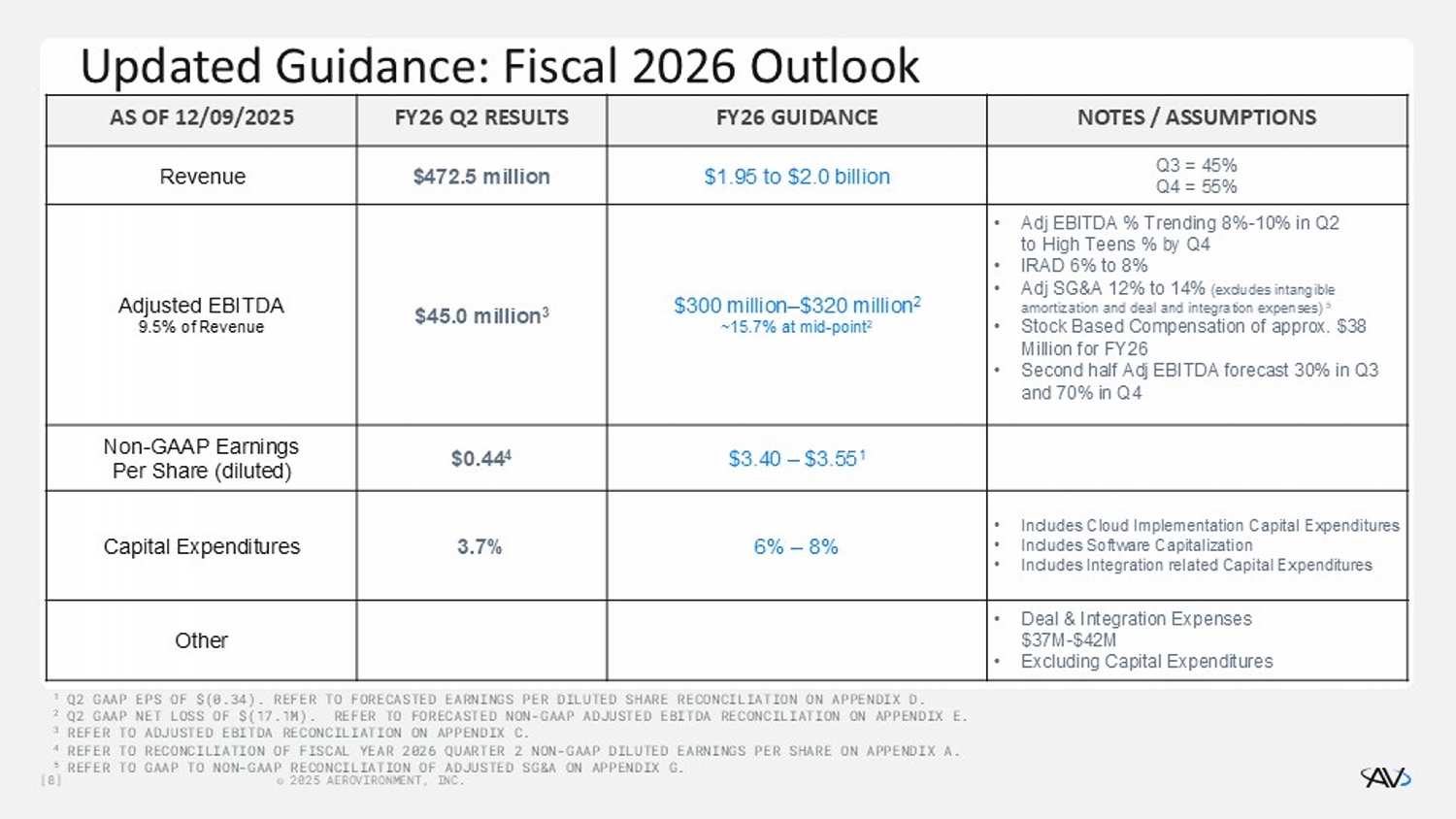© 2025 AEROVIRONMENT, INC. [ 8 ] Updated Guidance: Fiscal 2026 Outlook 1 Q2 GAAP EPS OF $(0.34). REFER TO FORECASTED EARNINGS PER DILUTE D SHARE RECONCILIATION ON APPENDIX D. 2 Q2 GAAP NET LOSS OF $(17.1M). REFER TO FORECASTED NON - GAAP ADJ USTED EBITDA RECONCILIATION ON APPENDIX E. 3 REFER TO ADJUSTED EBITDA RECONCILIATION ON APPENDIX C. 4 REFER TO RECONCILIATION OF FISCAL YEAR 2026 QUARTER 2 NON - GAAP DILUTED EARNINGS PER SHARE ON APPENDIX A. 5 REFER TO GAAP TO NON - GAAP RECONCILIATION OF ADJUSTED SG&A ON AP PENDIX G. NOTES / ASSUMPTIONS FY26 GUIDANCE FY26 Q2 RESULTS AS OF 12/09/2025 Q3 = 45% Q4 = 55% $1.95 to $2.0 billion $ 472.5 million Revenue • Adj EBITDA % Trending 8% - 10% in Q2 to High Teens % by Q4 • IRAD 6% to 8%​ • Adj SG&A 12% to 14% ​ (excludes intangible amortization and deal and integration expenses) 5 • Stock Based Compensation of approx. $38 Million for FY26 • Second half Adj EBITDA forecast 30% in Q3 and 70% in Q4 $300 million – $320 million 2 ~15.7% at mid - point 2 $45.0 million 3 Adjusted EBITDA 9.5% of Revenue $3.40 – $3.55 1 $ 0.44 4 Non - GAAP Earnings Per Share (diluted) • Includes Cloud Implementation Capital Expenditures • Includes Software Capitalization • Includes Integration related Capital Expenditures 6% – 8% 3.7% Capital Expenditures • Deal & Integration Expenses $37M - $42M​ • Excluding Capital Expenditures Other