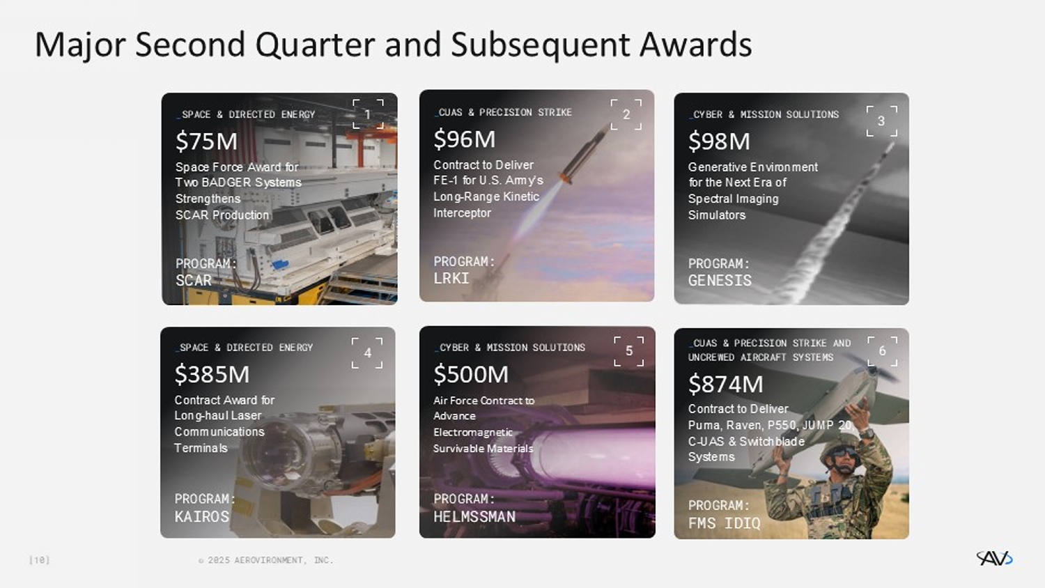 © 2025 AEROVIRONMENT, INC. [ 9 ] Revenue [Millions] Visibility for FY26 1 BASED ON MIDPOINT OF GUIDANCE RANGE OF $1.95 TO $2.0 BILLION. $454.7 $927.2 $1,003.8 $855.7 $675.7 $115.5 $43.8 $245.4 $175.4 $186.8 $- $250 $500 $750 $1,000 $1,250 $1,500 $1,750 $2,000 $2,250 $2,500 Q4 FY25 (6/24/25) Q1 FY26 (9/9/25) Q2 FY26 (12/9/25) Q3 FY26 Q4 FY26 Revenue: Unfunded Backlog Anticipated this FY Revenue: Qtr-to- Date Bookings Anticipated this FY Revenue: Funded Backlog Anticipated this FY Revenue Year-to- Date $ 112.0 Company visibility supports revenue guidance range 70 % visibility 1 Revenue Guidance Range : $ 1.95 to $ 2.0B 82 % visibility 1 93 % visibility 1