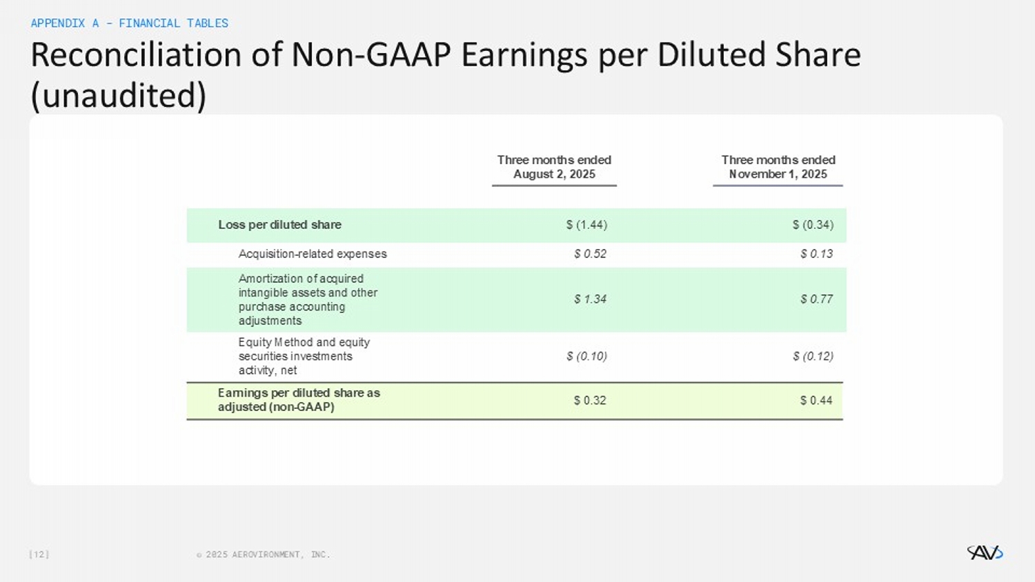 © 2025 AEROVIRONMENT, INC. [ 12 ] Reconciliation of Non - GAAP Earnings per Diluted Share (unaudited) APPENDIX A - FINANCIAL TABLES Three months ended November 1, 2025 Three months ended August 2, 2025 $ (0.34) $ (1.44) Loss per diluted share $ 0.13 $ 0.52 Acquisition - related expenses $ 0.77 $ 1.34 Amortization of acquired intangible assets and other purchase accounting adjustments $ (0.12) $ (0.10) Equity Method and equity securities investments activity, net $ 0.44 $ 0.32 Earnings per diluted share as adjusted (non - GAAP)