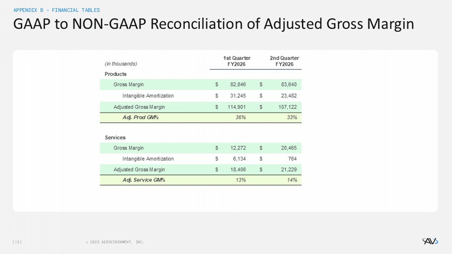 © 2025 AEROVIRONMENT, INC. [ 13 ] GAAP to NON - GAAP Reconciliation of Adjusted Gross Margin APPENDIX B - FINANCIAL TABLES 2nd Quarter FY2026 1st Quarter FY2026 (in thousands) Products 83,640 $ 82,846 $ Gross Margin 23,482 $ 31,245 $ Intangible Amortization 107,122 $ 114,901 $ Adjusted Gross Margin 33% 36% Adj. Prod GM% Services 20,465 $ 12,272 $ Gross Margin 764 $ 6,134 $ Intangible Amortization 21,229 $ 18,406 $ Adjusted Gross Margin 14% 13% Adj. Service GM%
