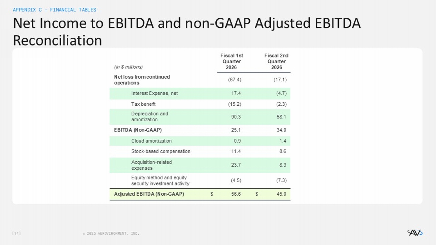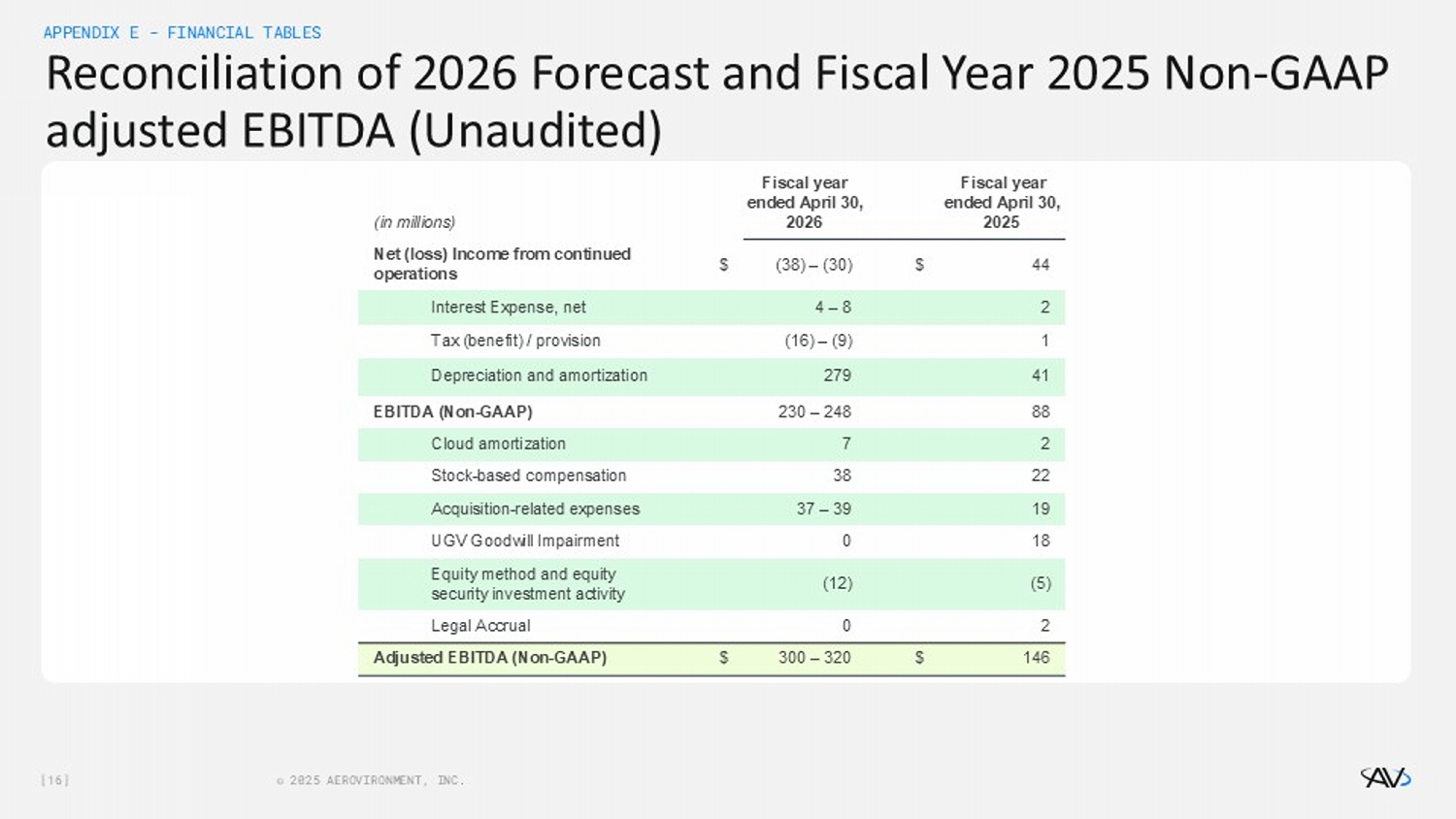 © 2025 AEROVIRONMENT, INC. [ 16 ] Reconciliation of 2026 Forecast and Fiscal Year 2025 Non - GAAP adjusted EBITDA (Unaudited) APPENDIX E - FINANCIAL TABLES Fiscal year ended April 30, 2025 Fiscal year ended April 30, 2026 (in millions) 44 $ (38) – (30) $ Net (loss) Income from continued operations 2 4 – 8 Interest Expense, net 1 (16) – (9) Tax (benefit) / provision 41 279 Depreciation and amortization 88 230 – 248 EBITDA (Non - GAAP) 2 7 Cloud amortization 22 38 Stock - based compensation 19 37 – 39 Acquisition - related expenses 18 0 UGV Goodwill Impairment (5) (12) Equity method and equity security investment activity 2 0 Legal Accrual 146 $ 300 – 320 $ Adjusted EBITDA (Non - GAAP)