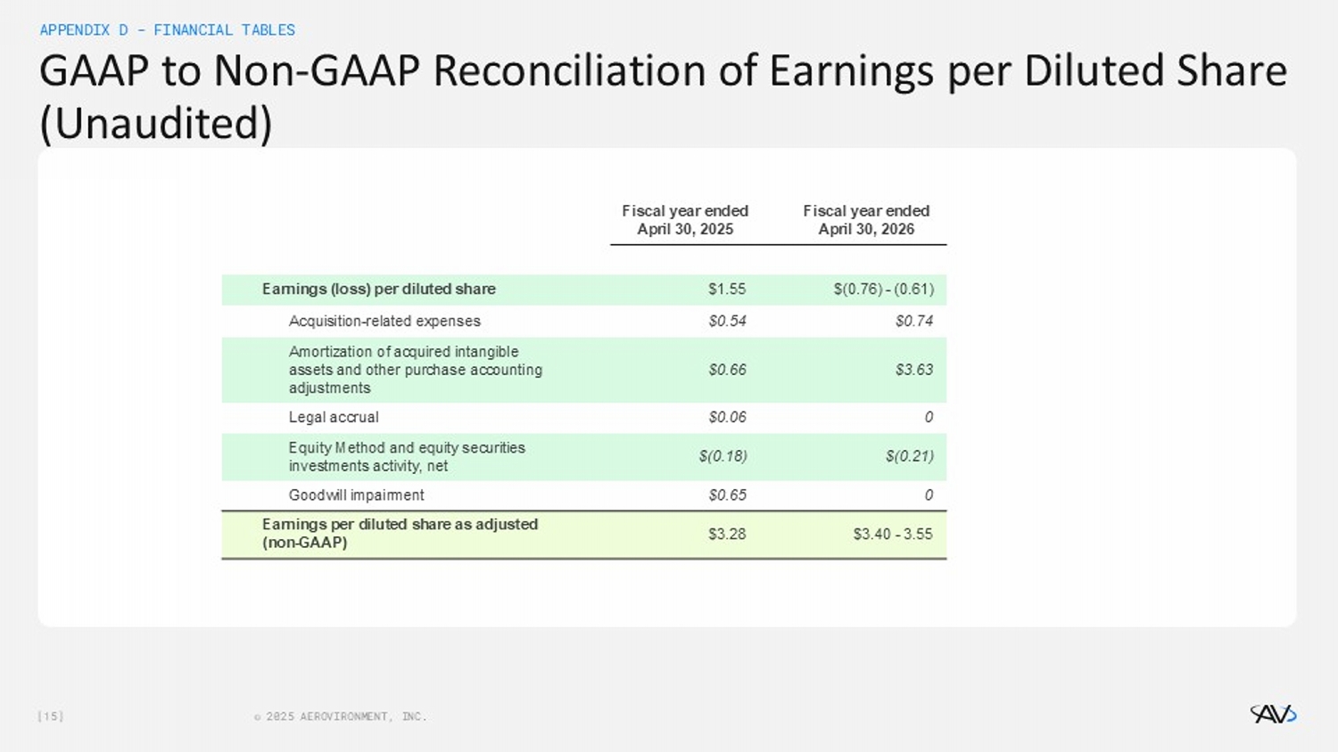 © 2025 AEROVIRONMENT, INC. [ 15 ] GAAP to Non - GAAP Reconciliation of Earnings per Diluted Share (Unaudited) APPENDIX D - FINANCIAL TABLES Fiscal year ended April 30, 2026 Fiscal year ended April 30, 2025 $(0.76) - (0.61) $1.55 Earnings (loss) per diluted share $0.74 $0.54 Acquisition - related expenses $3.63 $0.66 Amortization of acquired intangible assets and other purchase accounting adjustments 0 $0.06 Legal accrual $(0.21) $(0.18) Equity Method and equity securities investments activity, net 0 $0.65 Goodwill impairment $3.40 - 3.55 $3.28 Earnings per diluted share as adjusted (non - GAAP)