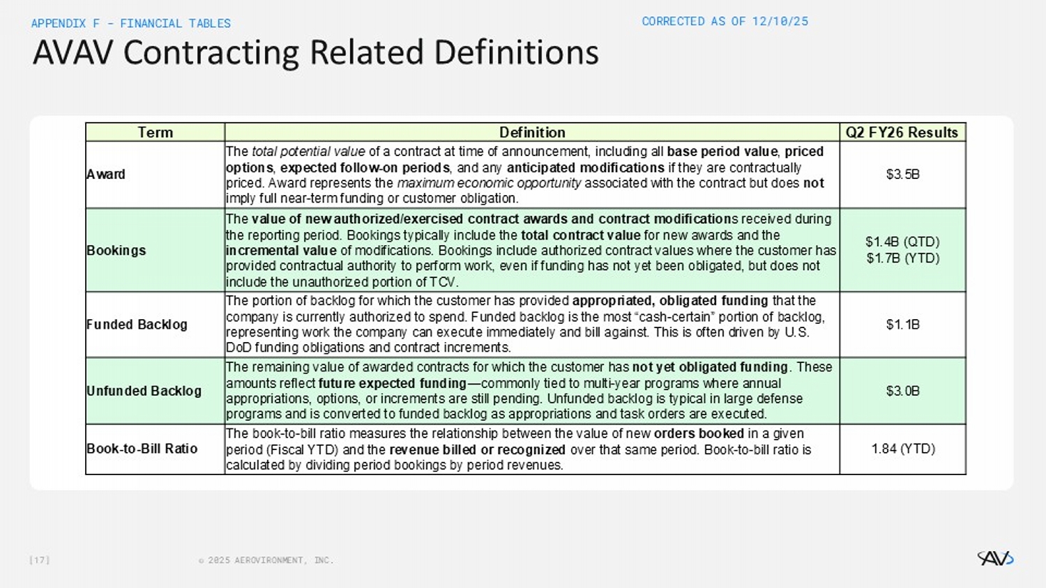 © 2025 AEROVIRONMENT, INC. [ 17 ] AVAV Contracting Related Definitions APPENDIX F - FINANCIAL TABLES Q2 FY26 Results Definition Term $3.5B The total potential value of a contract at time of announcement, including all base period value , priced options , expected follow - on periods , and any anticipated modifications if they are contractually priced. Award represents the maximum economic opportunity associated with the contract but does not imply full near - term funding or customer obligation. Award $1.4B (QTD) $1.7B (YTD) The value of new authorized/exercised contract awards and contract modification s received during the reporting period. Bookings typically include the total contract value for new awards and the incremental value of modifications. Bookings include authorized contract values where the customer has provided contractual authority to perform work, even if funding has not yet been obligated, but does not include the unauthorized portion of TCV. Bookings $1.1B The portion of backlog for which the customer has provided appropriated, obligated funding that the company is currently authorized to spend. Funded backlog is the most “cash - certain” portion of backlog, representing work the company can execute immediately and bill against. This is often driven by U.S. DoD funding obligations and contract increments. Funded Backlog $3.0B The remaining value of awarded contracts for which the customer has not yet obligated funding . These amounts reflect future expected funding — commonly tied to multi - year programs where annual appropriations, options, or increments are still pending. Unfunded backlog is typical in large defense programs and is converted to funded backlog as appropriations and task orders are executed. Unfunded Backlog 1.84 (YTD) The book - to - bill ratio measures the relationship between the value of new orders booked in a given period (Fiscal YTD) and the revenue billed or recognized over that same period. Book - to - bill ratio is calculated by dividing period bookings by period revenues. Book - to - Bill Ratio CORRECTED AS OF 12/10/25