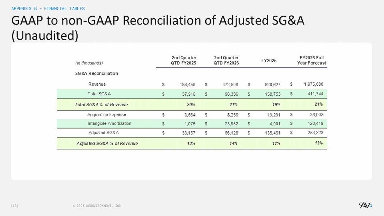 © 2025 AEROVIRONMENT, INC. [ 18 ] GAAP to non - GAAP Reconciliation of Adjusted SG&A (Unaudited) APPENDIX G - FINANCIAL TABLES FY2026 Full Year Forecast FY2025 2nd Quarter QTD FY2026 2nd Quarter QTD FY2025 (in thousands) SG&A Reconciliation 1,975,000 $ 820,627 $ 472,508 $ 188,458 $ Revenue 411,744 $ 158,753 $ 98,336 $ 37,916 $ Total SG&A 21% 19% 21% 20% Total SG&A % of Revenue 38,002 $ 19,291 $ 8,256 $ 3,684 $ Acquisition Expense 120,419 $ 4,001 $ 23,952 $ 1,075 $ Intangible Amortization 253,323 $ 135,461 $ 66,128 $ 33,157 $ Adjusted SG&A 13% 17% 14% 18% Adjusted SG&A % of Revenue