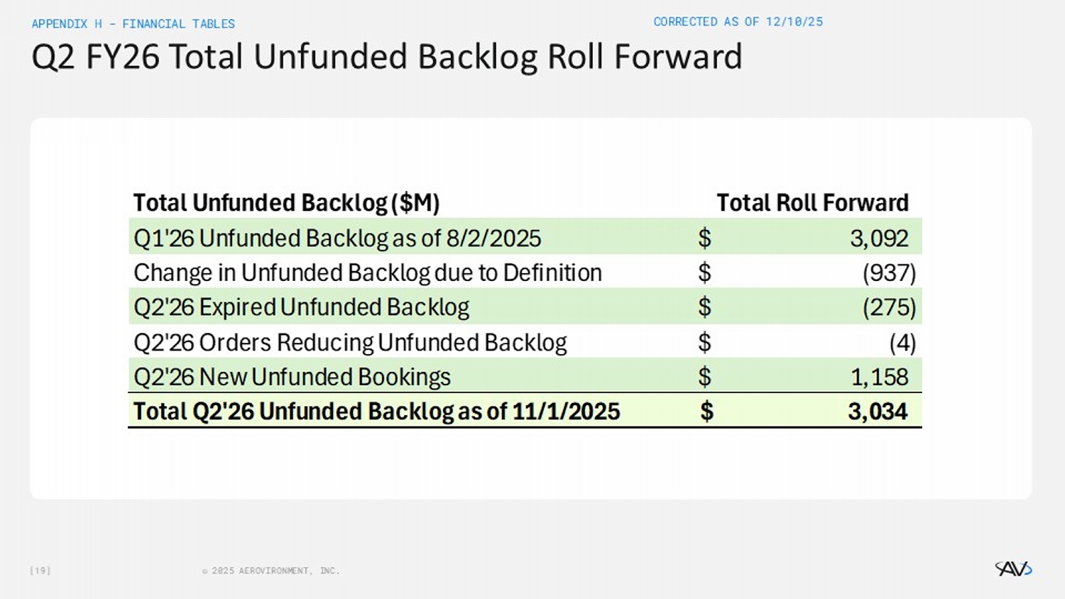 © 2025 AEROVIRONMENT, INC. [ 19 ] Q2 FY26 Total Unfunded Backlog Roll Forward APPENDIX H - FINANCIAL TABLES Total Unfunded Backlog ($M) Total Roll Forward Q1'26 Unfunded Backlog as of 8/2/2025 3,092$ Change in Unfunded Backlog due to Definition (937)$ Q2'26 Expired Unfunded Backlog (275)$ Q2'26 Orders Reducing Unfunded Backlog (4)$ Q2'26 New Unfunded Bookings 1,158$ Total Q2'26 Unfunded Backlog as of 11/1/2025 3,034$ CORRECTED AS OF 12/10/25
