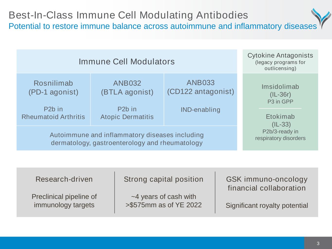 2 This presentation and any accompanying oral presentation contains forward-looking statements within the meaning of the "safe harbor" provisions of the Private Securities Litigation Reform Act of 1995, including, but not limited to: the timing of initiation of the Company’s clinical trials, including rosnilimab’s clinical trials in rheumatoid arthritis and in a second indication and ANB032’s clinical trial in atopic dermatitis; the timing of the release of data from the Company’s clinical trials, including imsidolimab’s Phase 3 clinical trial in GPP, rosnilimab’s Phase 2b clinical trial in rheumatoid arthritis and ANB032’s Phase 2b clinical trial in atopic dermatitis; the timing of ANB033’s IND filing; statements regarding efficacy, safety and proof of mechanism from blinded data from rosnilimab’s clinical trial in alopecia areata; the Company’s ability to find a licensing partner for imsidolimab or etokimab and the timing of any such transaction; and the Company’s projected cash runway. Statements including words such as “plan,” “continue,” “expect,” or “ongoing” and statements in the future tense are forward-looking statements. These forward-looking statements involve risks and uncertainties, as well as assumptions, which, if they do not fully materialize or prove incorrect, could cause its results to differ materially from those expressed or implied by such forward-looking statements. Forward-looking statements are subject to risks and uncertainties that may cause the company’s actual activities or results to differ significantly from those expressed in any forward- looking statement, including risks and uncertainties related to the company’s ability to advance its product candidates, obtain regulatory approval of and ultimately commercialize its product candidates, the timing and results of preclinical and clinical trials, the company’s ability to fund development activities and achieve development goals, the company’s ability to protect intellectual property and other risks and uncertainties described under the heading “Risk Factors” in documents the company files from time to time with the Securities and Exchange Commission. These forward-looking statements speak only as of the date of this presentation, and the company undertakes no obligation to revise or update any forward-looking statements to reflect events or circumstances after the date hereof. Certain information contained in this presentation may be derived from information provided by industry sources. The Company believes such information is accurate and that the sources from which it has been obtained are reliable. However, the Company cannot guarantee the accuracy of, and has not independently verified, such information. The trademarks included herein are the property of the owners thereof and are used for reference purposes only. Such use should not be construed as an endorsement of such products. Safe Harbor Statement
