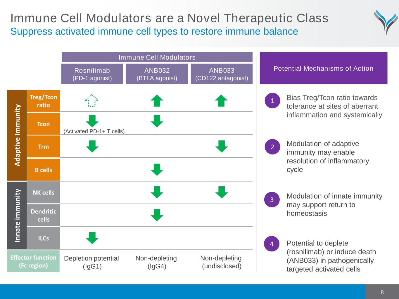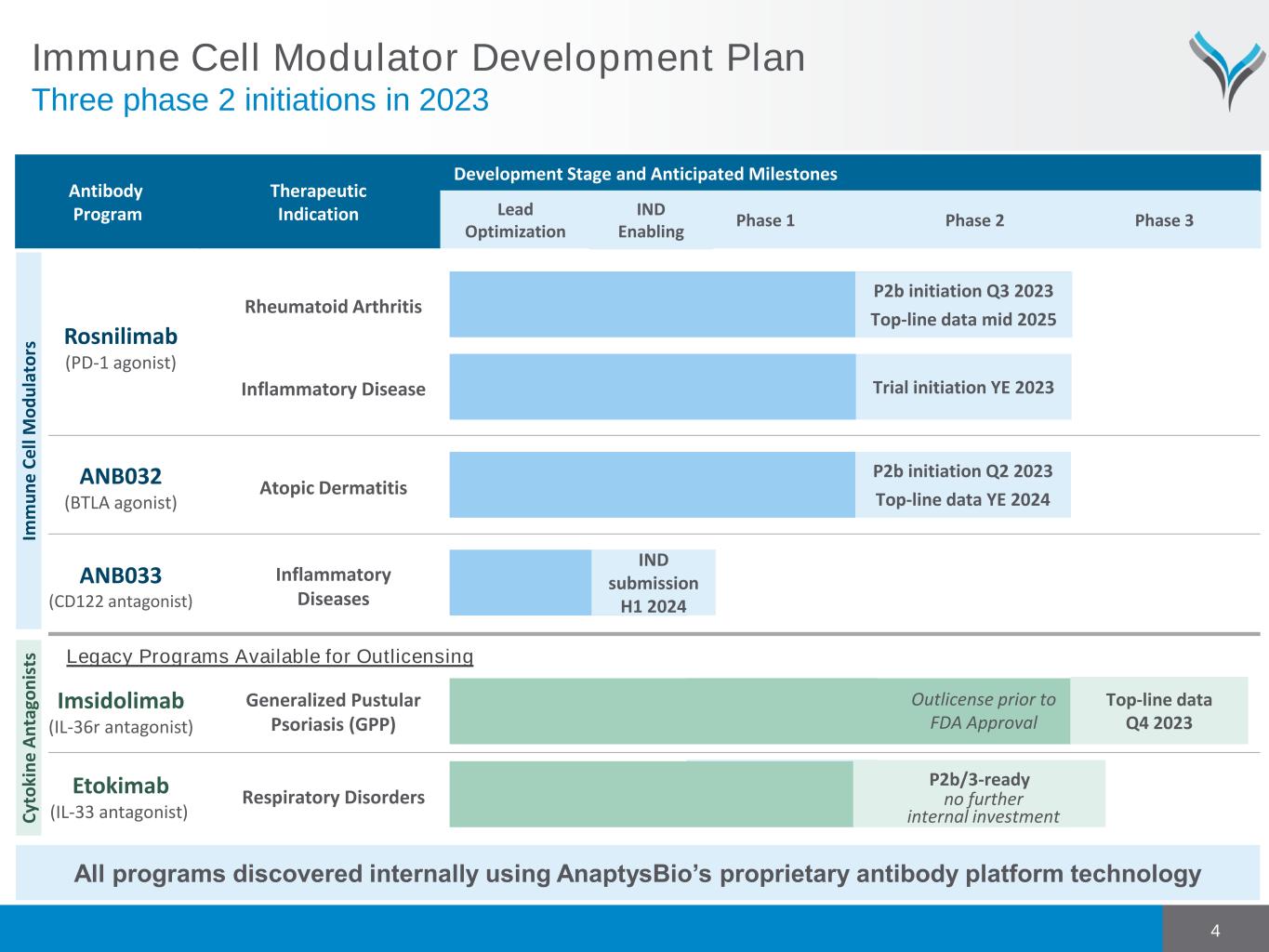3 Best-In-Class Immune Cell Modulating Antibodies Potential to restore immune balance across autoimmune and inflammatory diseases Strong capital position ~4 years of cash with >$575mm as of YE 2022 GSK immuno-oncology financial collaboration Significant royalty potential Research-driven Preclinical pipeline of immunology targets Immune Cell Modulators ANB033 (CD122 antagonist) IND-enabling Imsidolimab (IL-36r) P3 in GPP Etokimab (IL-33) P2b/3-ready in respiratory disorders Cytokine Antagonists (legacy programs for outlicensing) Rosnilimab (PD-1 agonist) P2b in Rheumatoid Arthritis ANB032 (BTLA agonist) P2b in Atopic Dermatitis Autoimmune and inflammatory diseases including dermatology, gastroenterology and rheumatology