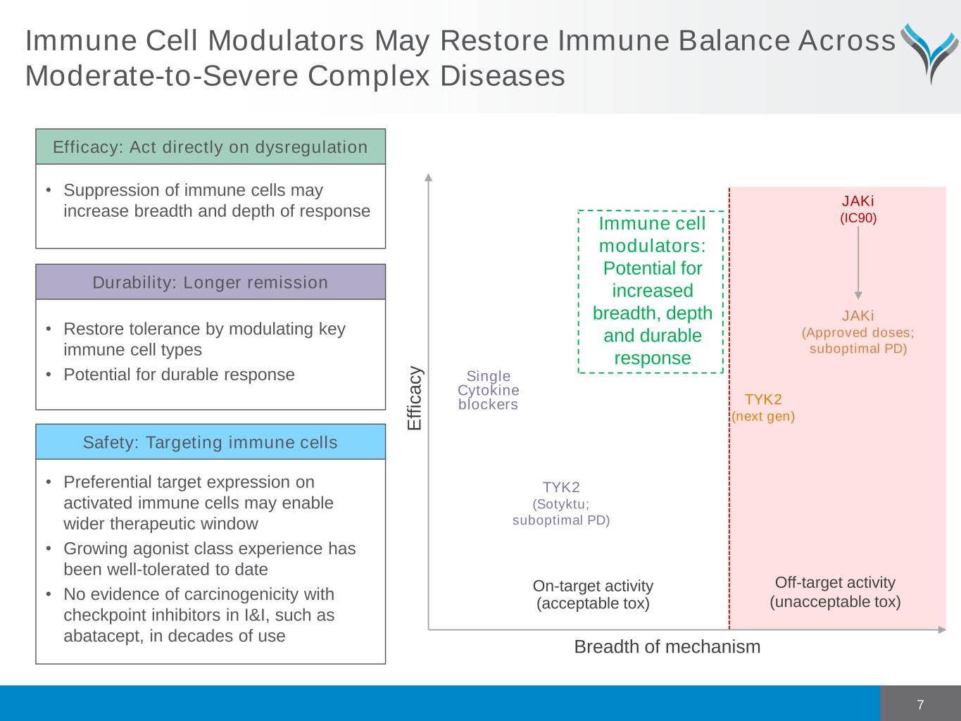 6 Moderate-to-Severe Inflammatory Diseases are Complex, Leading to Shortcomings in SOC Therapies Breadth of mechanism Cell signaling inhibitors: efficacy ceiling with AEs at most effective doses TYK2 (next gen) • Complex, heterogeneous diseases involve upregulation of multiple cytokines • Treatment requires more than a single cytokine blocker Efficacy • Downstream intervention does not target underlying dysregulation • Chronic treatment required to suppress symptoms Durability • Cell signaling inhibitors (e.g. JAKi) with broad activity, have significant tox - Black-box warning risks include major cardiac and thrombotic events Safety Single Cytokine blockers TYK2 (Sotyktu; suboptimal PD) E ff ic a c y On-target activity (acceptable tox) Off-target activity (unacceptable tox) JAKi (IC90) JAKi (Approved doses; suboptimal PD)