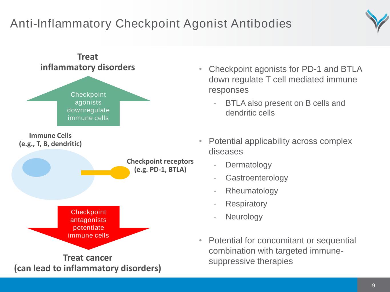 9 • Checkpoint agonists for PD-1 and BTLA down regulate T cell mediated immune responses - BTLA also present on B cells and dendritic cells • Potential applicability across complex diseases - Dermatology - Gastroenterology - Rheumatology - Respiratory - Neurology • Potential for concomitant or sequential combination with targeted immune- suppressive therapies Immune Cells (e.g., T, B, dendritic) Checkpoint receptors (e.g. PD-1, BTLA) Treat cancer (can lead to inflammatory disorders) Checkpoint antagonists potentiate immune cells Checkpoint agonists downregulate immune cells Treat inflammatory disorders Anti-Inflammatory Checkpoint Agonist Antibodies