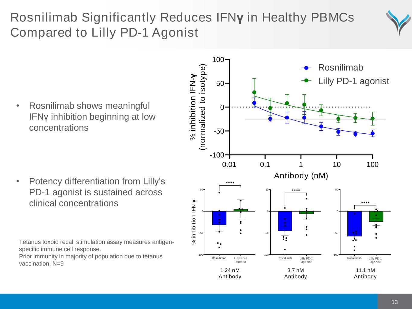 • Rosnilimab shows meaningful IFNγ inhibition beginning at low concentrations • Potency differentiation from Lilly’s PD-1 agonist is sustained across clinical concentrations Tetanus toxoid recall stimulation assay measures antigen- specific immune cell response. Prior immunity in majority of population due to tetanus vaccination, N=9 0.01 0.1 1 10 100 -100 -50 0 50 100 5 Day PBMC TT recall assay n = 9 healthy donors Antibody (nM) % i n h ib it io n I F N -γ (n o rm a li z e d t o i s o ty p e ) Rosnilimab LLY PD-1 agonist Rosnilimab Lilly PD-1 agonist Rosnilimab LLY -100 -50 0 50 1.24 nM Antibody % i n h ib it io n I F N -γ ✱✱✱✱ Rosnilimab LLY -100 -50 0 50 3.7 nM Antibody % i n h ib it io n I F N -γ ✱✱✱✱ Rosnilimab LLY -100 -50 0 50 11.1 nM Antibody % i n h ib it io n I F N -γ ✱✱✱✱ Lilly PD-1 agonist Lilly PD-1 agonist Lilly PD-1 agonist Rosnilimab Significantly Reduces IFNγ in Healthy PBMCs Compared to Lilly PD-1 Agonist 13