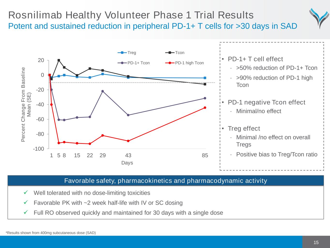 Rosnilimab Healthy Volunteer Phase 1 Trial Results Potent and sustained reduction in peripheral PD-1+ T cells for >30 days in SAD -100 -80 -60 -40 -20 0 20 1 5 8 15 22 29 43 85 P e rc e n t C h a n g e F ro m B a s e li n e M e a n ( S E ) Days Treg Tcon PD-1+ Tcon PD-1 high Tcon ✓ Well tolerated with no dose-limiting toxicities ✓ Favorable PK with ~2 week half-life with IV or SC dosing ✓ Full RO observed quickly and maintained for 30 days with a single dose Favorable safety, pharmacokinetics and pharmacodynamic activity • PD-1+ T cell effect - >50% reduction of PD-1+ Tcon - >90% reduction of PD-1 high Tcon • PD-1 negative Tcon effect - Minimal/no effect • Treg effect - Minimal /no effect on overall Tregs - Positive bias to Treg/Tcon ratio *Results shown from 400mg subcutaneous dose (SAD) 15