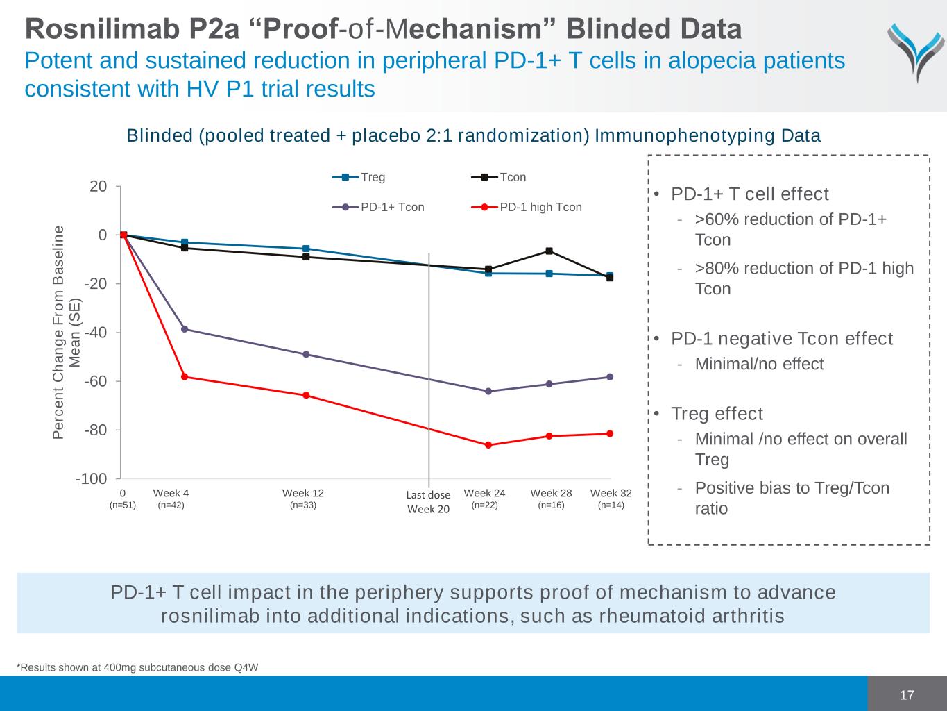 Rosnilimab 400 mg SC q4w N = 4 5 R an d o m iz ed 2 :1 Placebo Treatment Period Follow-Up Period W e e k 0 W e e k 2 4 W e e k 3 2 W e e k 2 0 Last Dose “Proof of Mechanism” P2a Blinded Pooled Interim Data Peripheral T cell effect • Impact on activated T cells and Tcon / Treg ratio in blood and implications for broader inflammatory diseases through week 32 ✓ Robust reductions in peripheral PD-1+ T cells observed in AA patients consistent with HV P1 trial Change in SALT score (primary endpoint) • Commercially relevant in absolute SALT <20 (secondary endpoint) X Modest improvement in some patients observed through week 24+; No patients with absolute SALT<20 Durability • Maintenance of change in SALT score through week 32 • TBD; patients with SALT improvement observed were stable off treatment through weeks 28 - 32 Safety and tolerability ✓ Generally safe and well tolerated Additional P2a Data Available H2 23 • Tissue Biopsies - Impact on reduction of PD-1+ T cells and cytokines in hair follicle (inflamed tissue) • Circulating Biomarkers & T Cell Phenotyping - Impact on reduction of PD-1+ T cells, including Tregs and Tcons, and cytokines in periphery Rosnilimab “Proof of Mechanism” Phase 2a Trial in Moderate-to-Severe Alopecia Areata 16