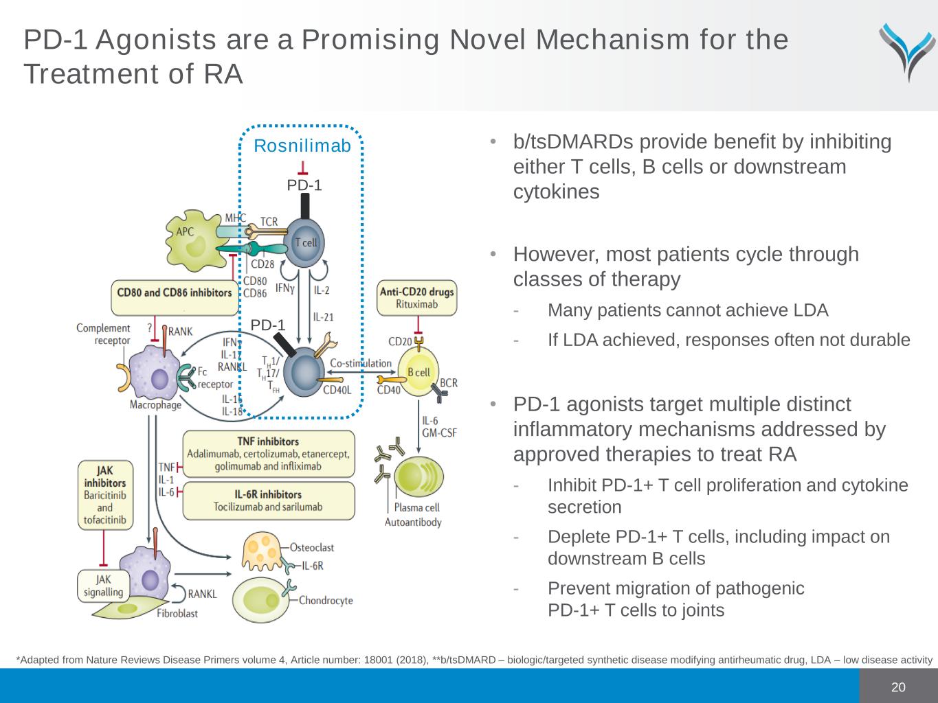 19 Initiation of Autoimmunity Pre-symptomatic RA Mild RA Moderate-to-Severe RA CD3+ T cells PD-L1PD-1+ *Adapted from Nature Reviews Disease Primers volume 4, Article number: 18001 (2018) and PLoS One 2018; 13(2): e0192704 PD-1+ T Cells are Clinically Validated Drivers of Disease in RA >80% of T cells in treatment-naive RA joints are PD-1+ and not down-regulated due to lack of sufficient PD-L1 expression