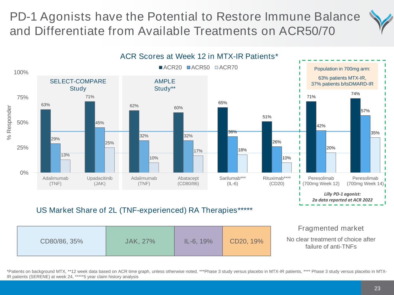 22 -40 -30 -20 -10 0 0 2 4 8 12 14 16 20 24 C h a n g e F ro m B a s e li n e Weeks CDAI* Lilly’s PD-1 Agonist Showed Proof of Mechanism and Promising Efficacy in a Phase 2a RA Study • 48% and 61% of patients achieved LDA at week 12 for 300 and 700 mg Q4Q IV doses • Patients achieving LDA at week 12 continued treatment through week 24 - At either dose, patient benefit was sustained • Similar responses observed regardless of whether a patient was naïve to or had received a prior b/tsDMARD Period 1 Period 2 * *** * *** Placebo (N=24) Peresolimab 300mg (N=25) Peresolimab 700mg (N=49) Peresolimab 300mg (N=12) Peresolimab 700mg (N=30) Patients achieving CDAI** LDA at Week 14 continued on peresolimab *Week 0 though Week 24 data estimated from peresolimab (PD-1 agonist) 2022 ACR presentation,**CDAI – clinical disease activity index, LDA – low disease activity
