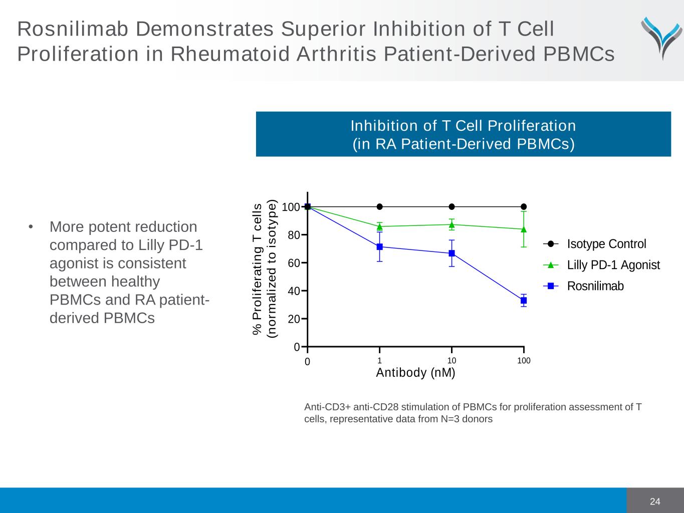 24 Inhibition of T Cell Proliferation (in RA Patient-Derived PBMCs) • More potent reduction compared to Lilly PD-1 agonist is consistent between healthy PBMCs and RA patient- derived PBMCs Anti-CD3+ anti-CD28 stimulation of PBMCs for proliferation assessment of T cells, representative data from N=3 donors 0 0.1 1 10 100 0 20 40 60 80 100 Antibody (nM) % P ro li fe ra ti n g T c e ll s (n o rm a li z e d t o i s o ty p e ) Isotype Control Lilly PD-1 Agonist Rosnilimab 0 Rosnilimab Demonstrates Superior Inhibition of T Cell Proliferation in Rheumatoid Arthritis Patient-Derived PBMCs