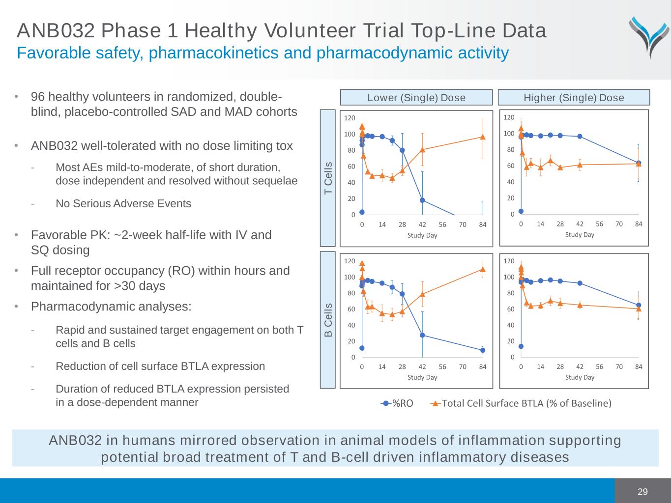 28 ANB032 Demonstrates Superior Agonistic Signaling in Healthy PBMCs Compared to Lilly BTLA Agonist 0.1 1 10 100 40 60 80 100 120 140 Antibody (nM) % P ro li fe ra ti n g T c e ll s (n o rm a li z e d t o i s o ty p e ) 0 0.1 1 10 100 40 60 80 100 120 140 Antibody (nM) % I F N -γ S e c re ti o n (n o rm a li z e d t o i s o ty p e ) Isotype Control Lilly BTLA Agonist ANB032 0 Inhibition of T cell Proliferation Inhibition of Th1 Cytokine Secretion 0.1 1 10 100 40 60 80 100 120 140 Antibody (nM) % I L -1 7 A S e c re ti o n (n o rm a li z e d t o i s o ty p e ) 0 0.1 1 10 100 40 60 80 100 120 140 Antibody (nM) % I L -1 3 S e c re ti o n (n o rm a li z e d t o i s o ty p e ) 0 Inhibition of Th17 Cytokine Secretion Inhibition of Th2 Cytokine Secretion Anti-CD3+ anti-CD28 stimulation of PBMCs for proliferation assessment of T cells and cytokine secretion; representative data from N=4 donors ANB032 shows meaningful T cell inhibition beginning at low concentrations and potency differentiation is sustained across clinical concentrations