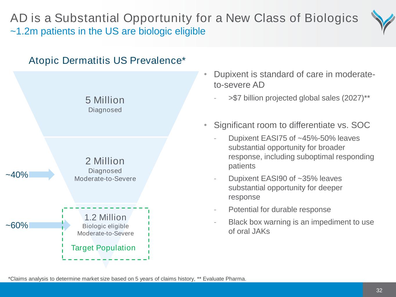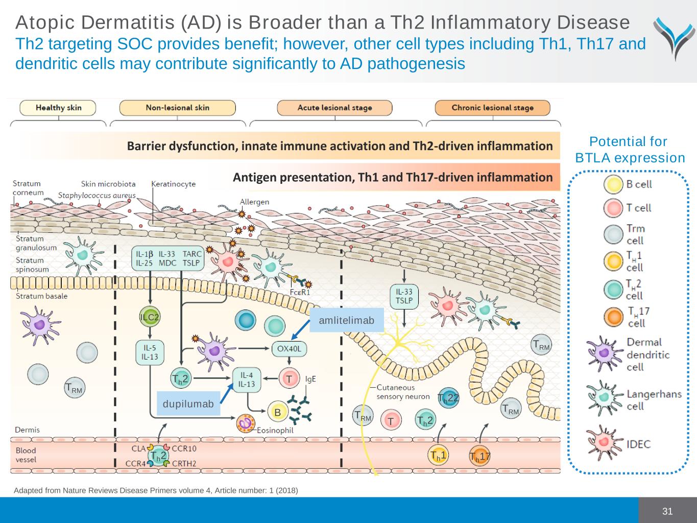 31 Th1Th2 ILC2 Th2 TRM TRM TRM TRM T T B Th17 Th2 Barrier dysfunction, innate immune activation and Th2-driven inflammation Antigen presentation, Th1 and Th17-driven inflammation Potential for BTLA expression Atopic Dermatitis (AD) is Broader than a Th2 Inflammatory Disease Th2 targeting SOC provides benefit; however, other cell types including Th1, Th17 and dendritic cells may contribute significantly to AD pathogenesis Adapted from Nature Reviews Disease Primers volume 4, Article number: 1 (2018) dupilumab amlitelimab Th22