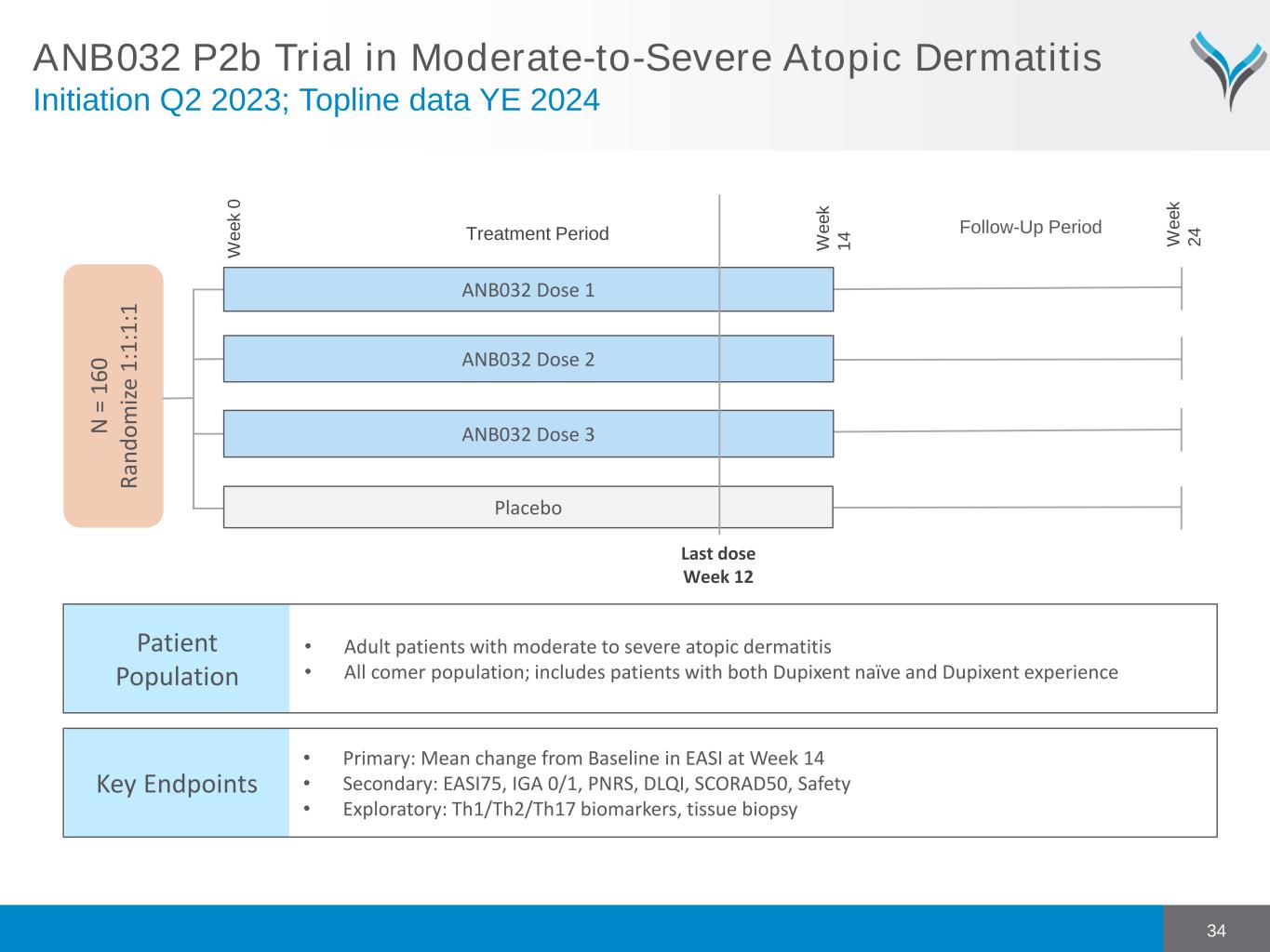 • Adult patients with moderate to severe atopic dermatitis • All comer population; includes patients with both Dupixent naïve and Dupixent experience Patient Population • Primary: Mean change from Baseline in EASI at Week 14 • Secondary: EASI75, IGA 0/1, PNRS, DLQI, SCORAD50, Safety • Exploratory: Th1/Th2/Th17 biomarkers, tissue biopsy Key Endpoints N = 1 6 0 R an d o m iz e 1 :1 :1 :1 Treatment Period W e e k 0 W e e k 1 4 Follow-Up Period W e e k 2 4 ANB032 Dose 1 Placebo ANB032 Dose 3 ANB032 Dose 2 Last dose Week 12 34 ANB032 P2b Trial in Moderate-to-Severe Atopic Dermatitis Initiation Q2 2023; Topline data YE 2024
