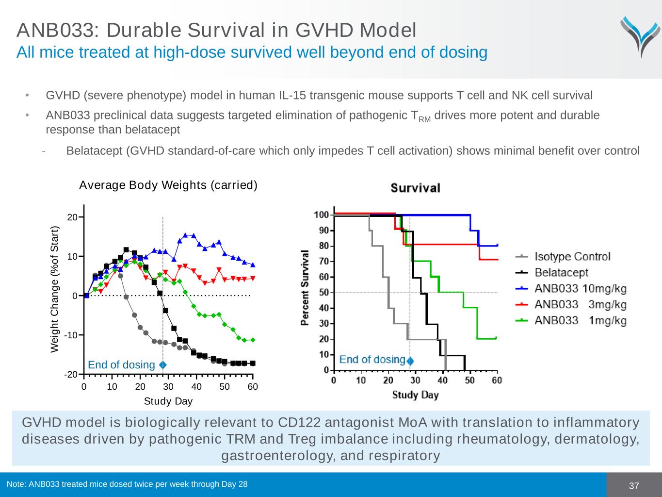 36 CD122 is a shared beta subunit of the receptors for IL-15 and IL-2 • IL-15 mediates survival of TRM cells • Both IL-15 and IL-2 mediate: - Proliferation of T cells - Inflammatory cytokine secretion (IFNγ) during T cell activation • High affinity antagonist antibody induces death in TRM cells by preferentially inhibiting the lower affinity dimeric receptor complex - Spares Tregs which express higher affinity IL-2 trimeric receptor complex • Targeted elimination of TRM cells may potentially drive durable responses ANB033 MoA: Induce death of TRM cells to achieve and maintain remission Tregs TRM cells CD122 CD122 ANB033 ANB033: Anti-CD122 Antagonist mAb Targets Pathogenic Tissue Resident Memory T Cells (TRM) IND filing targeted H1 2024