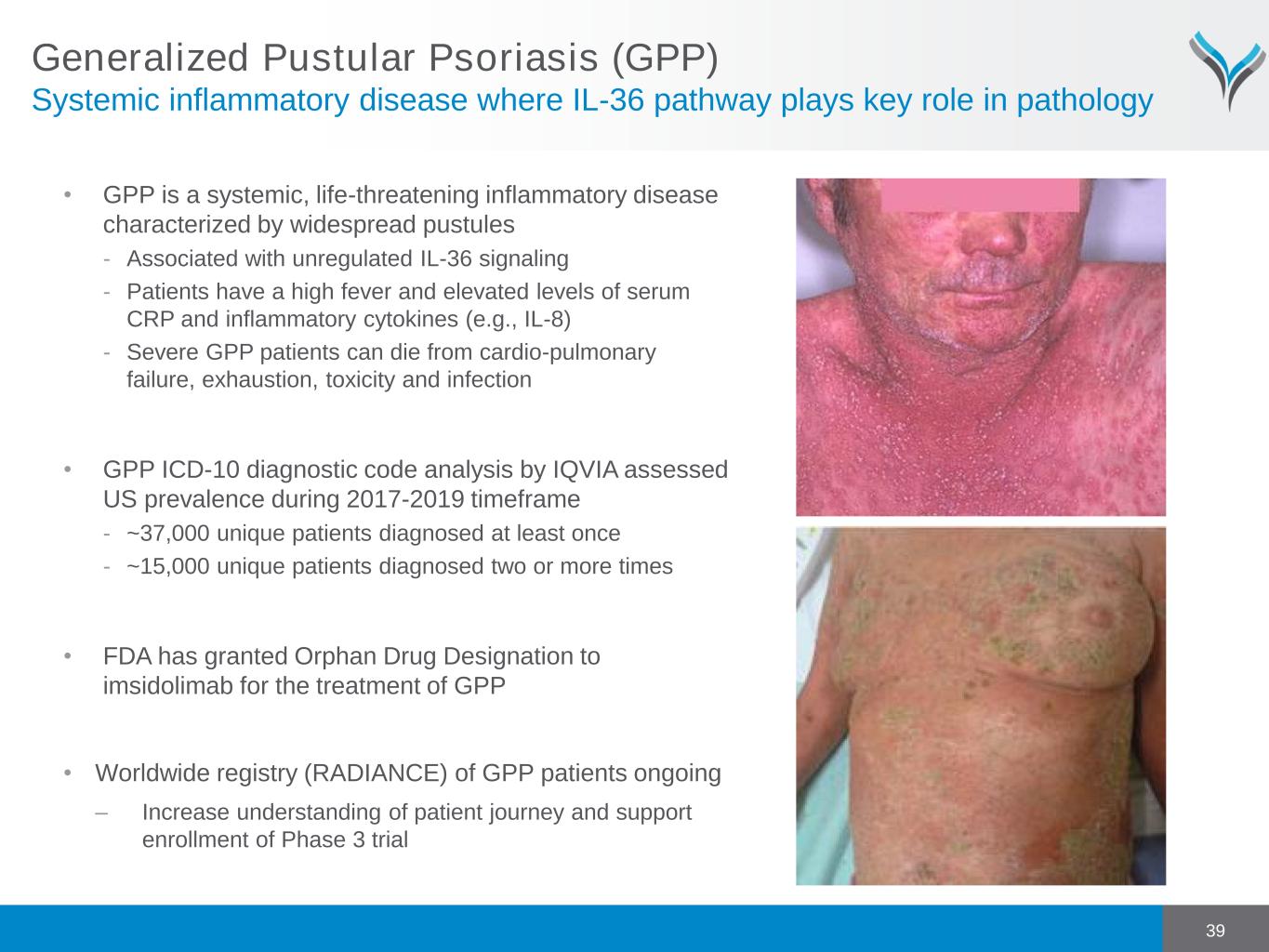 39 • GPP is a systemic, life-threatening inflammatory disease characterized by widespread pustules - Associated with unregulated IL-36 signaling - Patients have a high fever and elevated levels of serum CRP and inflammatory cytokines (e.g., IL-8) - Severe GPP patients can die from cardio-pulmonary failure, exhaustion, toxicity and infection • GPP ICD-10 diagnostic code analysis by IQVIA assessed US prevalence during 2017-2019 timeframe - ~37,000 unique patients diagnosed at least once - ~15,000 unique patients diagnosed two or more times • FDA has granted Orphan Drug Designation to imsidolimab for the treatment of GPP • Worldwide registry (RADIANCE) of GPP patients ongoing – Increase understanding of patient journey and support enrollment of Phase 3 trial Generalized Pustular Psoriasis (GPP) Systemic inflammatory disease where IL-36 pathway plays key role in pathology