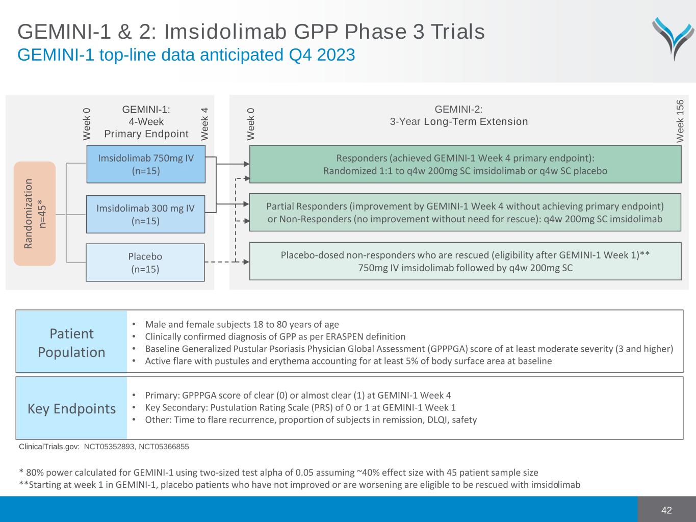 41 • Imsidolimab 750mg IV loading dose + 100mg SC q4w maintenance dose • Rapid and sustained efficacy through week 16 – 6 of 8 (75%) patients achieved primary endpoint of improvement in the clinical global impression scale (CGI) – Early reduction of erythema with skin pustules by week 1; sustained relative to baseline at week 16 – GPP Physician Global Assessment (GPPGPA) demonstrated sustained efficacy through week 16 – 2 patients dropped out of the study before Day 29 and deemed non-responders • Imsidolimab generally well-tolerated – Most adverse events were mild to moderate and resolved without sequelae – Two subjects had serious adverse events and recovered without sequelae (sepsis due to S. aureus infection and SARS-CoV-2 injection) • Genotypic testing indicated homozygous wild-type IL-36RN, CARD14 and AP1S3 alleles for all tested patients – IL-36R inhibition may be efficacious in GPP irrespective of genetic mutations Endpoint Baseline Week 1 Relative to Baseline Week 4 Relative to Baseline Week 16 Relative to Baseline CGI improvement (primary endpoint) N/A 7 of 8 patients 6 of 8 patients 6 of 8 patients mJDA-SI 9 -29% -54% -58% Erythema with pustules (% body surface area) 24% -60% -94% -98% DLQI (MCID of -4) 16 -1 -6 -11 Baseline Week 4 Week 16 GALLOP: Imsidolimab GPP Phase 2 Trial Top-Line Data Presented at EADV Congress October 2021