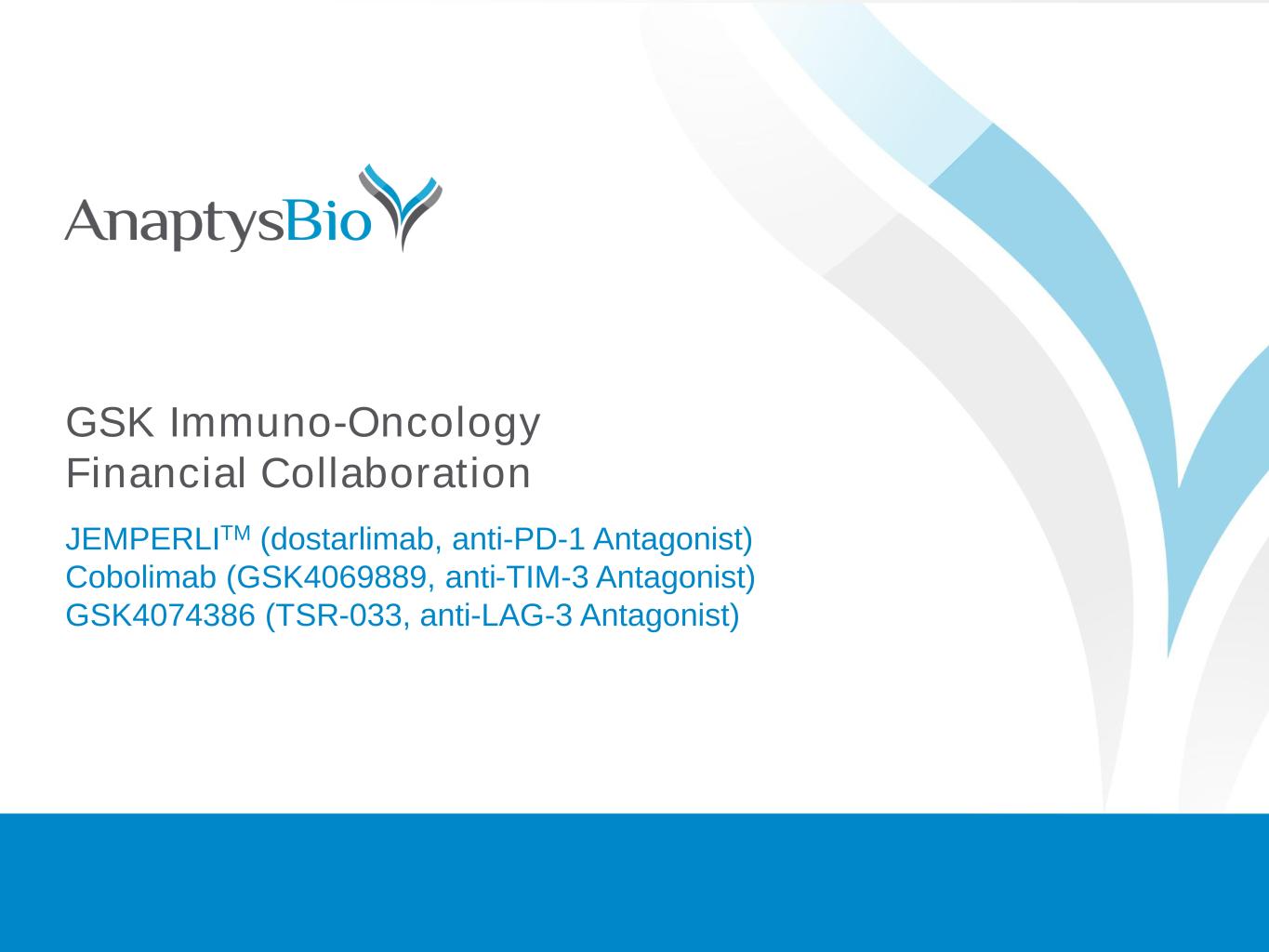 GSK Immuno-Oncology Financial Collaboration JEMPERLITM (dostarlimab, anti-PD-1 Antagonist) Cobolimab (GSK4069889, anti-TIM-3 Antagonist) GSK4074386 (TSR-033, anti-LAG-3 Antagonist)
