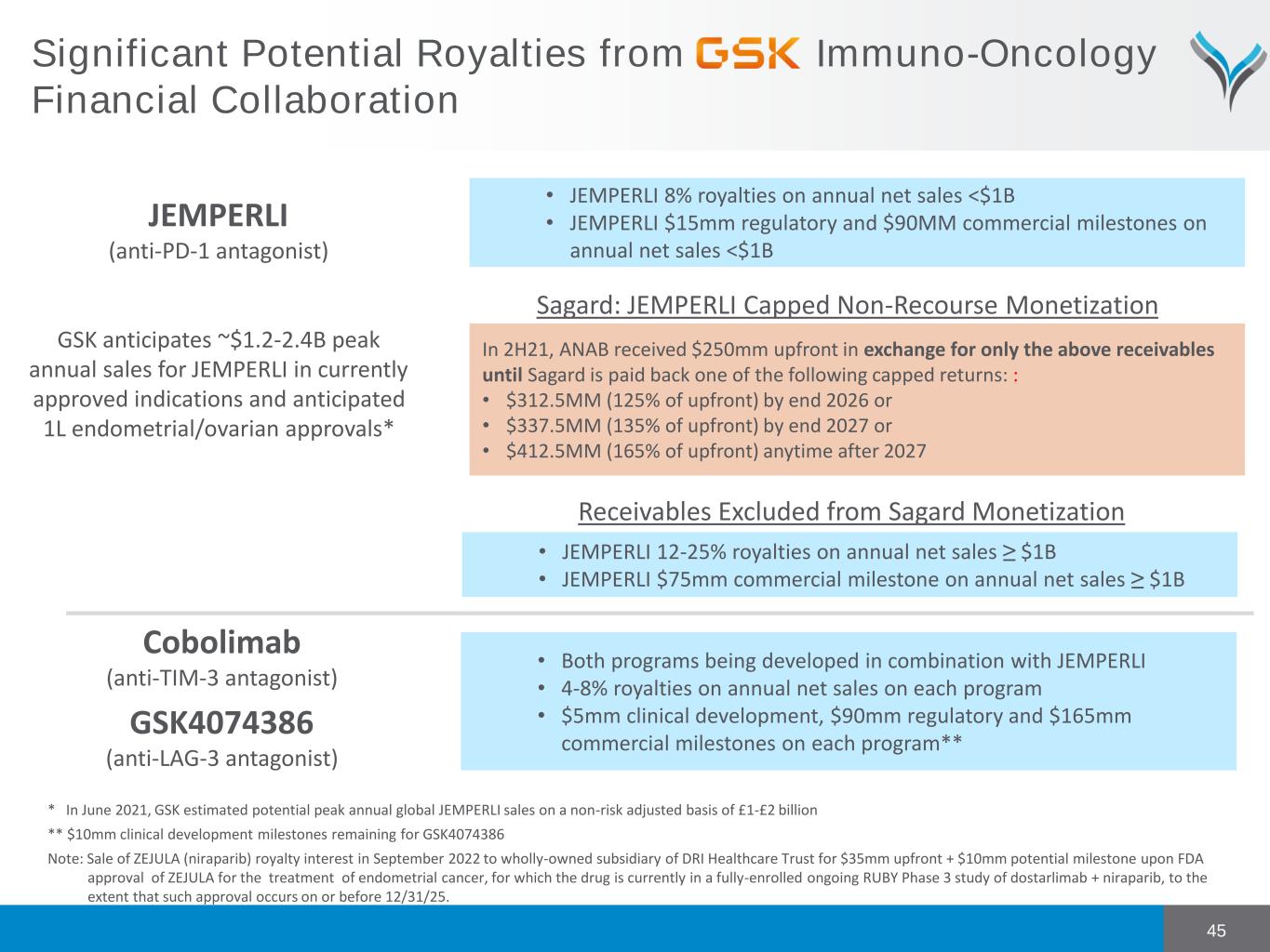 45 JEMPERLI (anti-PD-1 antagonist) GSK anticipates ~$1.2-2.4B peak annual sales for JEMPERLI in currently approved indications and anticipated 1L endometrial/ovarian approvals* • JEMPERLI 12-25% royalties on annual net sales ≥ $1B • JEMPERLI $75mm commercial milestone on annual net sales ≥ $1B In 2H21, ANAB received $250mm upfront in exchange for only the above receivables until Sagard is paid back one of the following capped returns: : • $312.5MM (125% of upfront) by end 2026 or • $337.5MM (135% of upfront) by end 2027 or • $412.5MM (165% of upfront) anytime after 2027 Sagard: JEMPERLI Capped Non-Recourse Monetization Cobolimab (anti-TIM-3 antagonist) GSK4074386 (anti-LAG-3 antagonist) • Both programs being developed in combination with JEMPERLI • 4-8% royalties on annual net sales on each program • $5mm clinical development, $90mm regulatory and $165mm commercial milestones on each program** * In June 2021, GSK estimated potential peak annual global JEMPERLI sales on a non-risk adjusted basis of £1-£2 billion ** $10mm clinical development milestones remaining for GSK4074386 Note: Sale of ZEJULA (niraparib) royalty interest in September 2022 to wholly-owned subsidiary of DRI Healthcare Trust for $35mm upfront + $10mm potential milestone upon FDA approval of ZEJULA for the treatment of endometrial cancer, for which the drug is currently in a fully-enrolled ongoing RUBY Phase 3 study of dostarlimab + niraparib, to the extent that such approval occurs on or before 12/31/25. Significant Potential Royalties from Immuno-Oncology Financial Collaboration Receivables Excluded from Sagard Monetization • JEMPERLI 8% royalties on annual net sales <$1B • JEMPERLI $15mm regulatory and $90MM commercial milestones on annual net sales <$1B