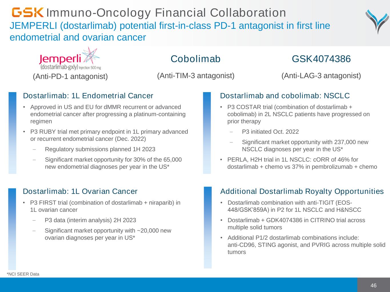 46 (Anti-PD-1 antagonist) Cobolimab (Anti-TIM-3 antagonist) GSK4074386 (Anti-LAG-3 antagonist) Dostarlimab: 1L Endometrial Cancer • Approved in US and EU for dMMR recurrent or advanced endometrial cancer after progressing a platinum-containing regimen • P3 RUBY trial met primary endpoint in 1L primary advanced or recurrent endometrial cancer (Dec. 2022) – Regulatory submissions planned 1H 2023 – Significant market opportunity for 30% of the 65,000 new endometrial diagnoses per year in the US* Dostarlimab and cobolimab: NSCLC • P3 COSTAR trial (combination of dostarlimab + cobolimab) in 2L NSCLC patients have progressed on prior therapy – P3 initiated Oct. 2022 – Significant market opportunity with 237,000 new NSCLC diagnoses per year in the US* • PERLA, H2H trial in 1L NSCLC: cORR of 46% for dostarlimab + chemo vs 37% in pembrolizumab + chemo Dostarlimab: 1L Ovarian Cancer • P3 FIRST trial (combination of dostarlimab + niraparib) in 1L ovarian cancer – P3 data (interim analysis) 2H 2023 – Significant market opportunity with ~20,000 new ovarian diagnoses per year in US* Additional Dostarlimab Royalty Opportunities • Dostarlimab combination with anti-TIGIT (EOS- 448/GSK’859A) in P2 for 1L NSCLC and H&NSCC • Dostarlimab + GDK4074386 in CITRINO trial across multiple solid tumors • Additional P1/2 dostarlimab combinations include: anti-CD96, STING agonist, and PVRIG across multiple solid tumors Immuno-Oncology Financial Collaboration JEMPERLI (dostarlimab) potential first-in-class PD-1 antagonist in first line endometrial and ovarian cancer *NCI SEER Data