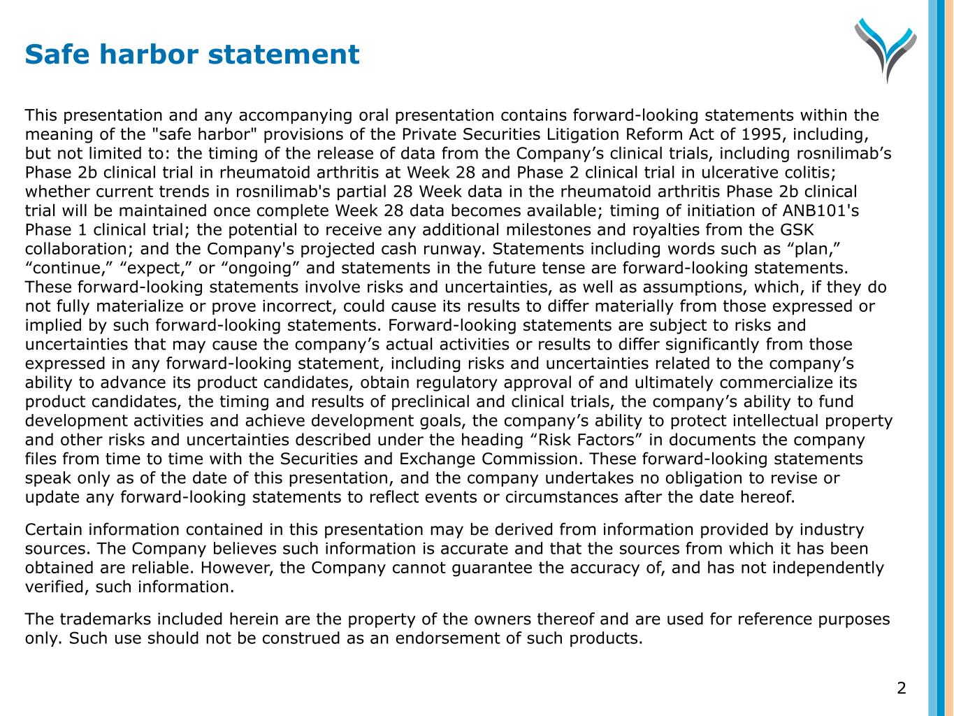 This presentation and any accompanying oral presentation contains forward-looking statements within the meaning of the "safe harbor" provisions of the Private Securities Litigation Reform Act of 1995, including, but not limited to: the timing of the release of data from the Company’s clinical trials, including rosnilimab’s Phase 2b clinical trial in rheumatoid arthritis at Week 28 and Phase 2 clinical trial in ulcerative colitis; whether current trends in rosnilimab's partial 28 Week data in the rheumatoid arthritis Phase 2b clinical trial will be maintained once complete Week 28 data becomes available; timing of initiation of ANB101's Phase 1 clinical trial; the potential to receive any additional milestones and royalties from the GSK collaboration; and the Company's projected cash runway. Statements including words such as “plan,” “continue,” “expect,” or “ongoing” and statements in the future tense are forward-looking statements. These forward-looking statements involve risks and uncertainties, as well as assumptions, which, if they do not fully materialize or prove incorrect, could cause its results to differ materially from those expressed or implied by such forward-looking statements. Forward-looking statements are subject to risks and uncertainties that may cause the company’s actual activities or results to differ significantly from those expressed in any forward-looking statement, including risks and uncertainties related to the company’s ability to advance its product candidates, obtain regulatory approval of and ultimately commercialize its product candidates, the timing and results of preclinical and clinical trials, the company’s ability to fund development activities and achieve development goals, the company’s ability to protect intellectual property and other risks and uncertainties described under the heading “Risk Factors” in documents the company files from time to time with the Securities and Exchange Commission. These forward-looking statements speak only as of the date of this presentation, and the company undertakes no obligation to revise or update any forward-looking statements to reflect events or circumstances after the date hereof. Certain information contained in this presentation may be derived from information provided by industry sources. The Company believes such information is accurate and that the sources from which it has been obtained are reliable. However, the Company cannot guarantee the accuracy of, and has not independently verified, such information. The trademarks included herein are the property of the owners thereof and are used for reference purposes only. Such use should not be construed as an endorsement of such products. 2 Safe harbor statement