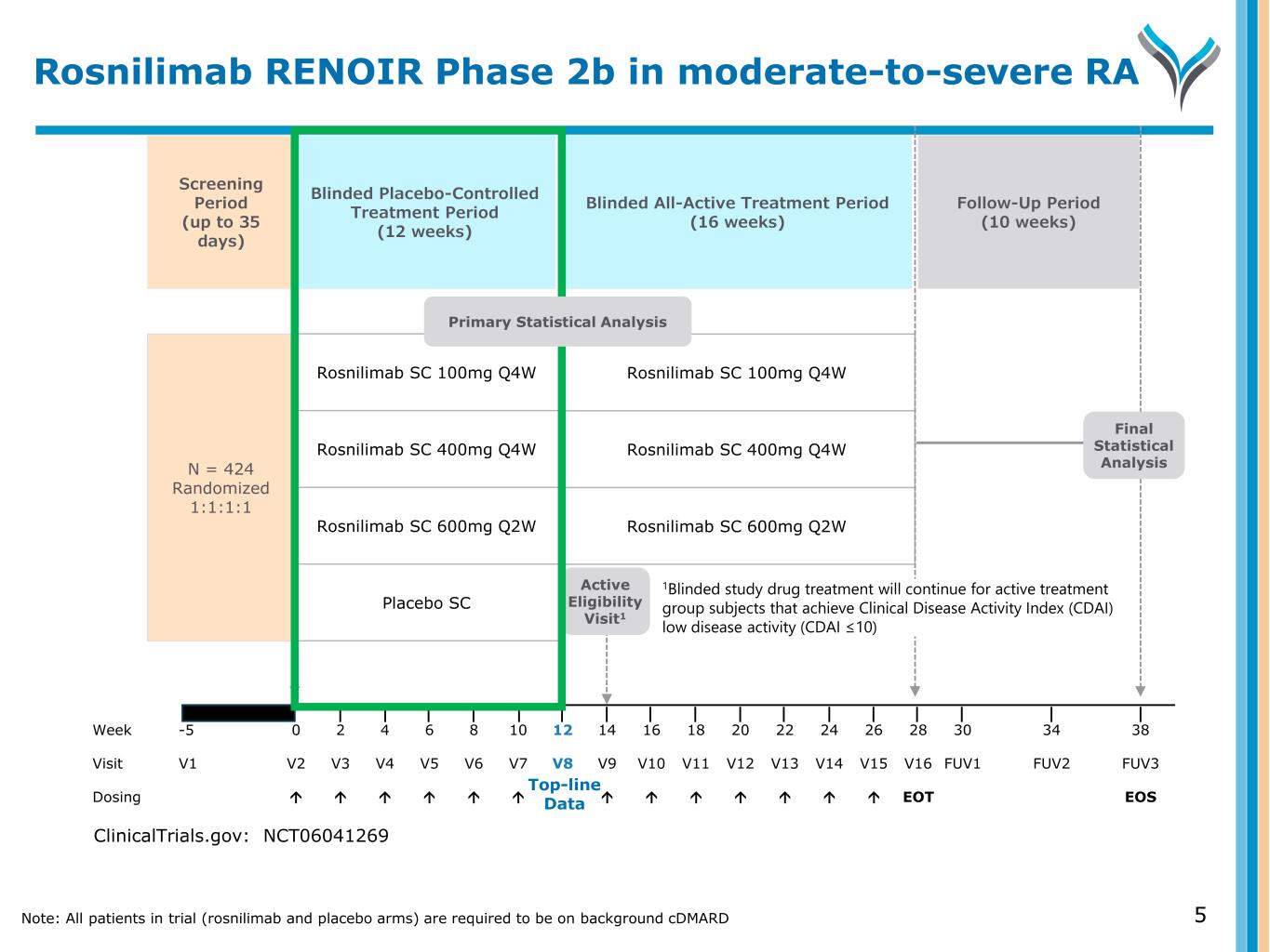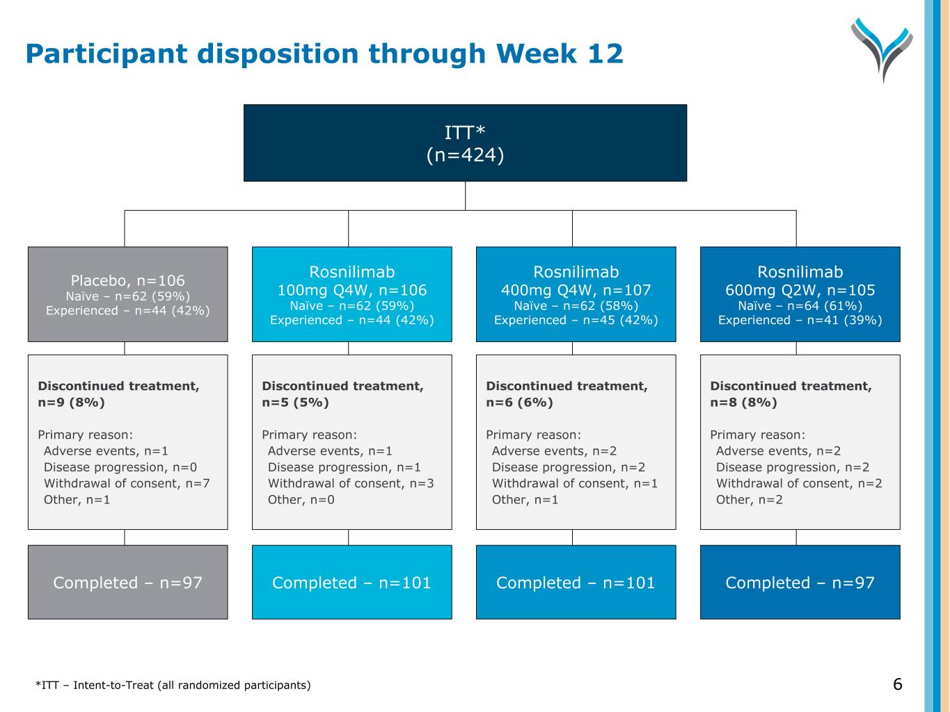 5 Screening Period (up to 35 days) Blinded Placebo-Controlled Treatment Period (12 weeks) Follow-Up Period (10 weeks) Blinded All-Active Treatment Period (16 weeks) Week -5 0 2 4 6 8 10 12 14 16 18 20 22 24 26 28 30 34 38 Visit V1 V2 V3 V4 V5 V6 V7 V8 V9 V10 V11 V12 V13 V14 V15 V16 FUV1 FUV2 FUV3 Dosing              EOT EOS Rosnilimab SC 100mg Q4W Rosnilimab SC 400mg Q4W Rosnilimab SC 600mg Q2W Placebo SC Rosnilimab SC 100mg Q4W Rosnilimab SC 400mg Q4W Rosnilimab SC 600mg Q2W N = 424 Randomized 1:1:1:1 Final Statistical Analysis Top-line Data 1Blinded study drug treatment will continue for active treatment group subjects that achieve Clinical Disease Activity Index (CDAI) low disease activity (CDAI ≤10) Active Eligibility Visit1 Primary Statistical Analysis Note: All patients in trial (rosnilimab and placebo arms) are required to be on background cDMARD ClinicalTrials.gov: NCT06041269 Rosnilimab RENOIR Phase 2b in moderate-to-severe RA
