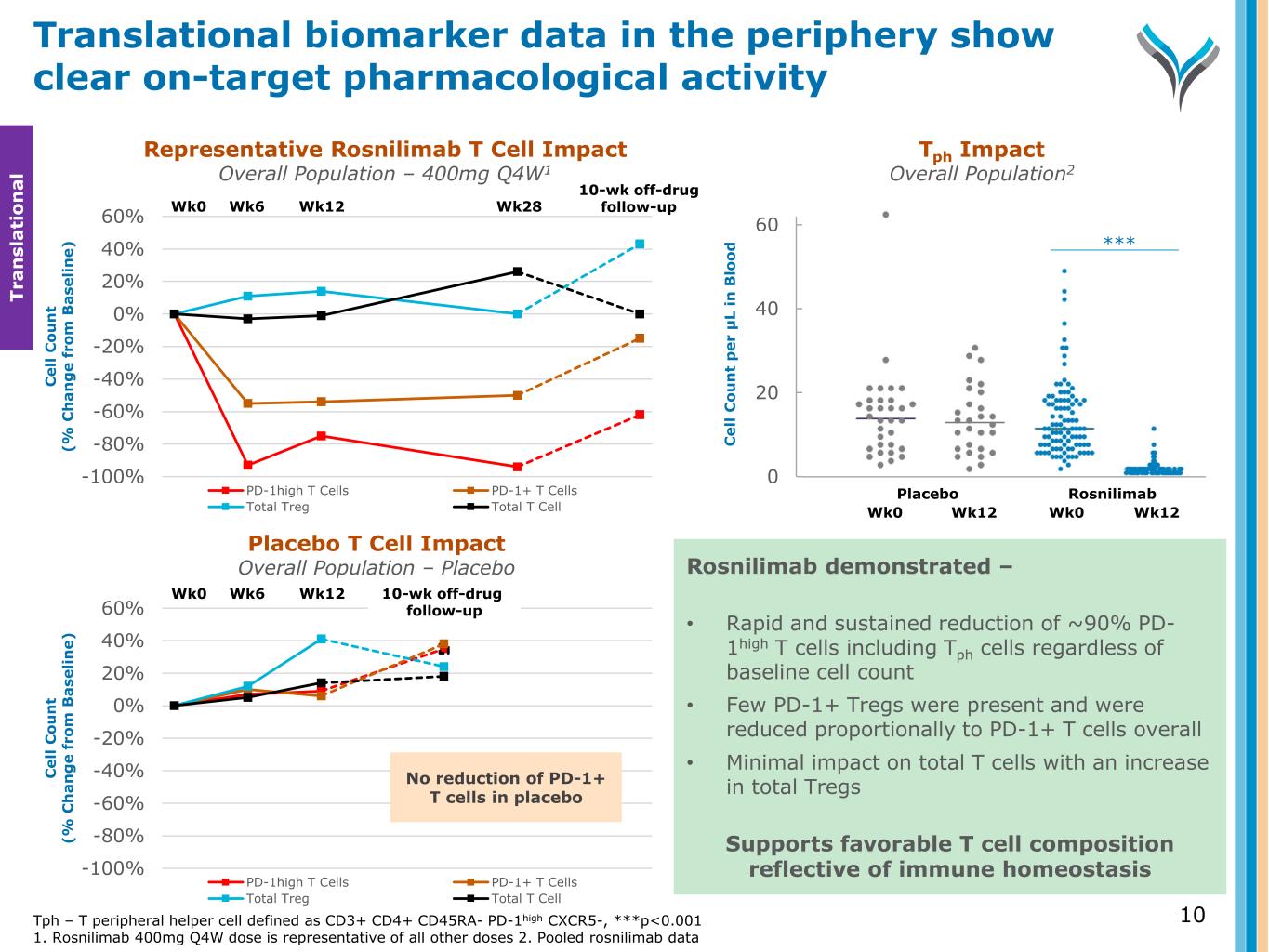 9 Adverse Events through Week 12, n (%) Placebo (n=106) 100mg Q4W (n=106) 400mg Q4W (n=107) 600mg Q2W (n=105) Participants with any AE, n (%) 36 (34%) 51 (48%) 48 (45%) 38 (36%) Any SAE1 1 (1%) 1 (1%) 1 (1%) 3 (3%) Any Drug-Related SAE 1 (1%) 0 (0%) 0 (0%) 0 (0%) Severe AE2 2 (2%) 1 (1%) 0 (0%) 4 (4%) Drug-Related AE 18 (17%) 13 (12%) 18 (17%) 17 (16%) Infections 14 (13%) 24 (23%) 21 (20%) 12 (11%) AE Leading to Treatment Discontinuation 1 (1%) 1 (1%) 2 (2%) 2 (2%) Participants with any AEs >5%, n Headache 4 (4%) 7 (7%) 6 (6%) 4 (4%) Upper respiratory tract infection 1 (1%) 7 (7%) 2 (2%) 3 (3%) • No malignancies • No MACE • No elevation of serious infections vs. placebo • No anaphylaxis or systemic hypersensitivity associated with rosnilimab • Low incidence of injection site reactions and similar to placebo Safety profile up to Week 28 remains consistent with reported profile through Week 12 1. SAEs (severe unless otherwise noted): pneumonia – mild (100 mg Q4W); meniscus tear – moderate (400 mg Q4W); anaphylaxis from wasp sting, ureter stone, and cholecystitis/pericardial effusion (600mg Q2W) and cellulitis/diarrhea (placebo) 2. Severe AE (excluding SAEs): flu (100mg Q4W); RA flare (600mg Q2W); macular degeneration/retinal hemorrhage (placebo) Rosnilimab was safe and well tolerated with similar adverse event rates vs. placebo
