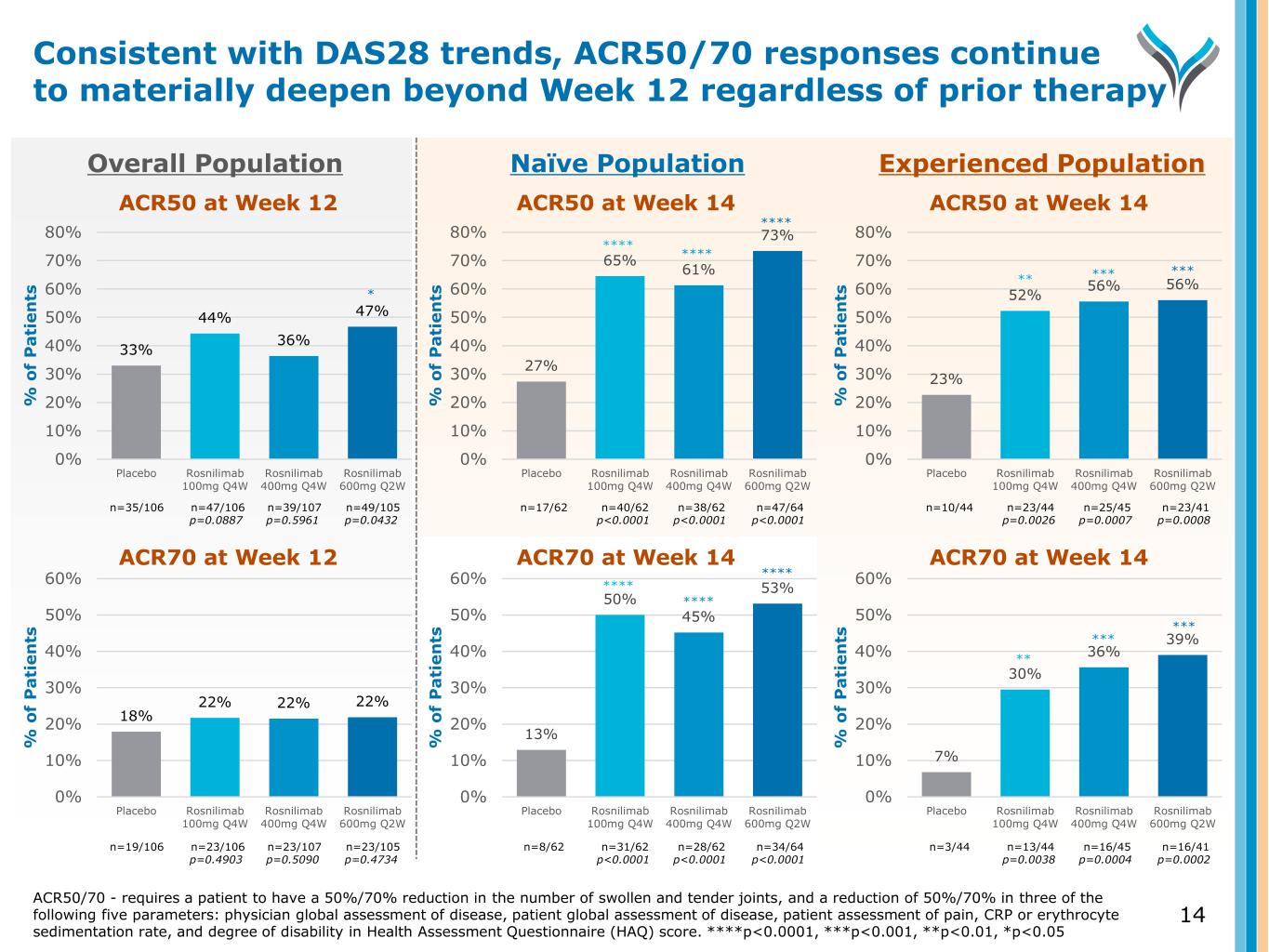 13 31% 46% 50% 38% 0% 10% 20% 30% 40% 50% 60% Placebo Rosnilimab 100mg Q4W Rosnilimab 400mg Q4W Rosnilimab 600mg Q2W % o f P a ti e n ts • Physicians minimally seek to achieve LDA by 6-months • Approximately half of rosnilimab-treated patients achieved LDA by Week 12 CDAI, a compositive assessment, is used to measure the severity of RA based on the sum of four assessment tools: the number of swollen and tender joints, the patient’s global disease activity index, and the physician’s global disease activity index. The score ranges from 0 to 76, with a score ≤ 10 is the threshold for LDA. ****p<0.0001, ***p<0.001, **p<0.01, *p<0.05 Statistically significant clinically meaningful benefit was observed within 3-months for majority of rosnilimab patients 53% 69% 70% 75% 0% 10% 20% 30% 40% 50% 60% 70% 80% Placebo Rosnilimab 100mg Q4W Rosnilimab 400mg Q4W Rosnilimab 600mg Q2W % o f P a ti e n ts n=33/106 n=49/106 p=0.0224 n=53/107 p=0.0053 n=40/105 p=0.2982 n=56/106 n=73/106 p=0.0149 n=75/107 p=0.0082 n=79/105 p=0.0005 *** ** * ** * S e co n d a ry E n d p o in t CDAI LDA of ≤ 10 at Week 12 Overall Population (n=424) ACR20 at Week 12 Overall Population (n=424)