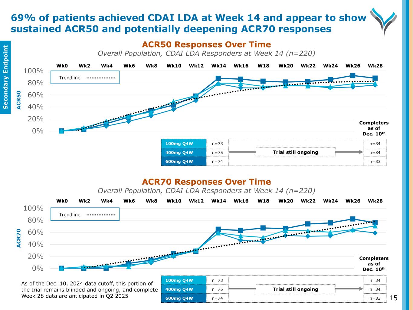 0% 20% 40% 60% 80% 100% A C R 5 0 Wk0 Wk2 Wk4 Wk6 Wk8 Wk10 Wk12 Wk14 Wk16 W18 Wk20 Wk22 Wk24 Wk26 Wk28 100mg Q4W n=73 n=34 400mg Q4W n=75 n=34 600mg Q4W n=74 n=33 0% 20% 40% 60% 80% 100% A C R 7 0 Wk0 Wk2 Wk4 Wk6 Wk8 Wk10 Wk12 Wk14 Wk16 W18 Wk20 Wk22 Wk24 Wk26 Wk28 Completers as of Dec. 10th 100mg Q4W n=73 n=34 400mg Q4W n=75 n=34 600mg Q4W n=74 n=33 Trial still ongoing ACR50 Responses Over Time Overall Population, CDAI LDA Responders at Week 14 (n=220) ACR70 Responses Over Time Overall Population, CDAI LDA Responders at Week 14 (n=220) Trendline S e co n d a ry E n d p o in t Trendline As of the Dec. 10, 2024 data cutoff, this portion of the trial remains blinded and ongoing, and complete Week 28 data are anticipated in Q2 2025 Trial still ongoing Completers as of Dec. 10th 69% of patients achieved CDAI LDA at Week 14 and appear to show sustained ACR50 and potentially deepening ACR70 responses 15