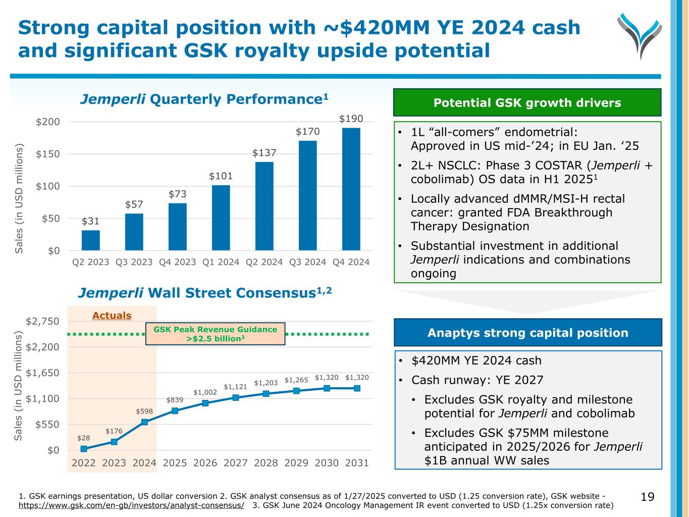 Actuals $31 $57 $73 $101 $137 $170 $190 $0 $50 $100 $150 $200 Q2 2023 Q3 2023 Q4 2023 Q1 2024 Q2 2024 Q3 2024 Q4 2024 S al es ( in U S D m ill io ns ) Jemperli Quarterly Performance1 1. GSK earnings presentation, US dollar conversion 2. GSK analyst consensus as of 1/27/2025 converted to USD (1.25 conversion rate), GSK website - https://www.gsk.com/en-gb/investors/analyst-consensus/ 3. GSK June 2024 Oncology Management IR event converted to USD (1.25x conversion rate) $28 $176 $598 $839 $1,002 $1,121 $1,203 $1,265 $1,320 $1,320 $0 $550 $1,100 $1,650 $2,200 $2,750 2022 2023 2024 2025 2026 2027 2028 2029 2030 2031 S al es ( in U S D m ill io ns ) Jemperli Wall Street Consensus1,2 Potential GSK growth drivers • 1L “all-comers” endometrial: Approved in US mid-’24; in EU Jan. ‘25 • 2L+ NSCLC: Phase 3 COSTAR (Jemperli + cobolimab) OS data in H1 20251 • Locally advanced dMMR/MSI-H rectal cancer: granted FDA Breakthrough Therapy Designation • Substantial investment in additional Jemperli indications and combinations ongoing GSK Peak Revenue Guidance >$2.5 billion3 Anaptys strong capital position • $420MM YE 2024 cash • Cash runway: YE 2027 • Excludes GSK royalty and milestone potential for Jemperli and cobolimab • Excludes GSK $75MM milestone anticipated in 2025/2026 for Jemperli $1B annual WW sales Strong capital position with ~$420MM YE 2024 cash and significant GSK royalty upside potential 19