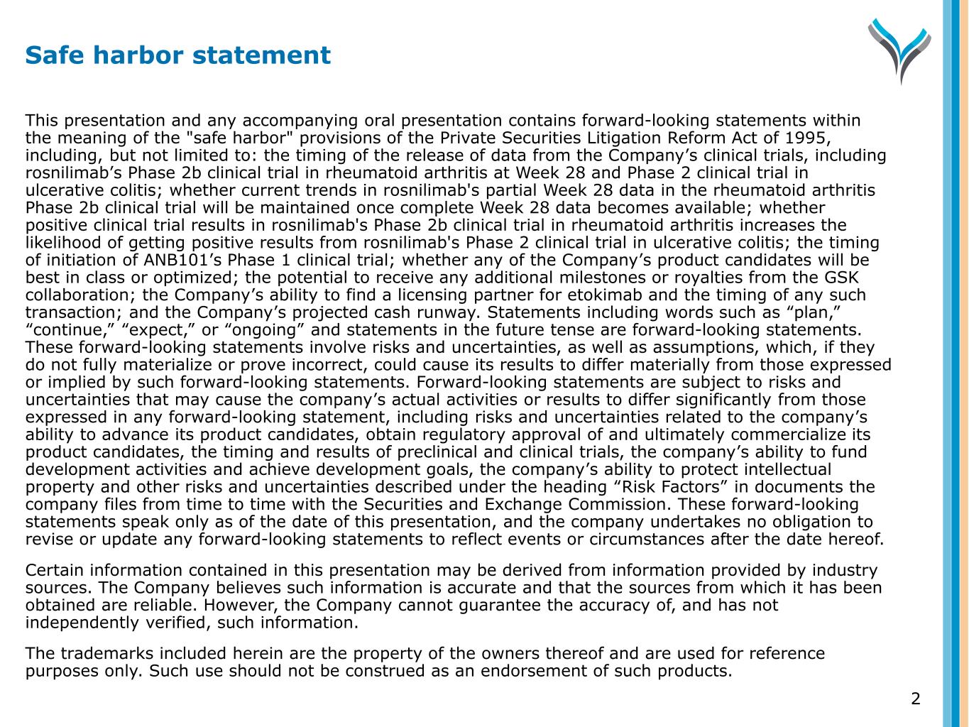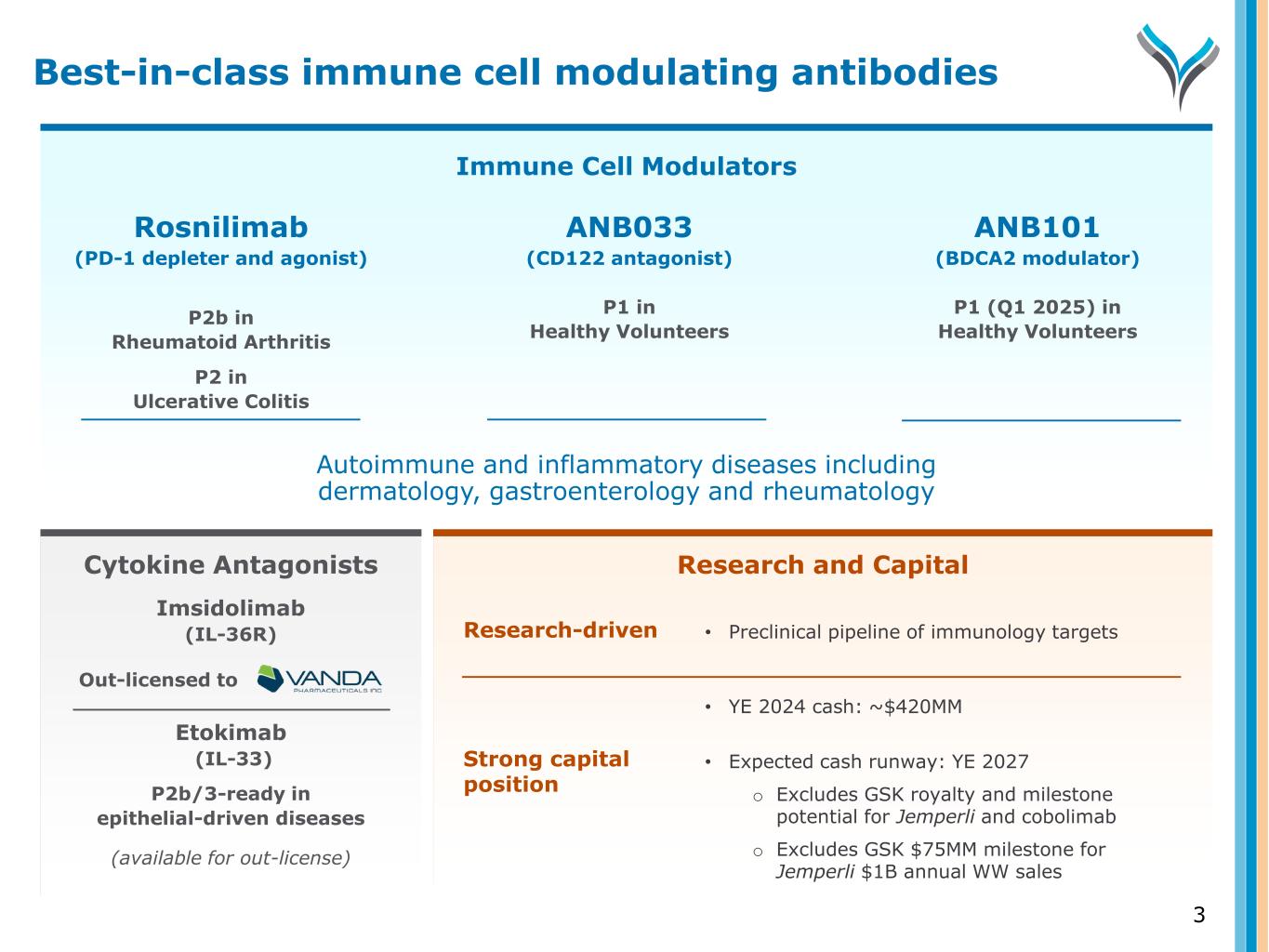 This presentation and any accompanying oral presentation contains forward-looking statements within the meaning of the "safe harbor" provisions of the Private Securities Litigation Reform Act of 1995, including, but not limited to: the timing of the release of data from the Company’s clinical trials, including rosnilimab’s Phase 2b clinical trial in rheumatoid arthritis at Week 28 and Phase 2 clinical trial in ulcerative colitis; whether current trends in rosnilimab's partial Week 28 data in the rheumatoid arthritis Phase 2b clinical trial will be maintained once complete Week 28 data becomes available; whether positive clinical trial results in rosnilimab's Phase 2b clinical trial in rheumatoid arthritis increases the likelihood of getting positive results from rosnilimab's Phase 2 clinical trial in ulcerative colitis; the timing of initiation of ANB101’s Phase 1 clinical trial; whether any of the Company’s product candidates will be best in class or optimized; the potential to receive any additional milestones or royalties from the GSK collaboration; the Company’s ability to find a licensing partner for etokimab and the timing of any such transaction; and the Company’s projected cash runway. Statements including words such as “plan,” “continue,” “expect,” or “ongoing” and statements in the future tense are forward-looking statements. These forward-looking statements involve risks and uncertainties, as well as assumptions, which, if they do not fully materialize or prove incorrect, could cause its results to differ materially from those expressed or implied by such forward-looking statements. Forward-looking statements are subject to risks and uncertainties that may cause the company’s actual activities or results to differ significantly from those expressed in any forward-looking statement, including risks and uncertainties related to the company’s ability to advance its product candidates, obtain regulatory approval of and ultimately commercialize its product candidates, the timing and results of preclinical and clinical trials, the company’s ability to fund development activities and achieve development goals, the company’s ability to protect intellectual property and other risks and uncertainties described under the heading “Risk Factors” in documents the company files from time to time with the Securities and Exchange Commission. These forward-looking statements speak only as of the date of this presentation, and the company undertakes no obligation to revise or update any forward-looking statements to reflect events or circumstances after the date hereof. Certain information contained in this presentation may be derived from information provided by industry sources. The Company believes such information is accurate and that the sources from which it has been obtained are reliable. However, the Company cannot guarantee the accuracy of, and has not independently verified, such information. The trademarks included herein are the property of the owners thereof and are used for reference purposes only. Such use should not be construed as an endorsement of such products. 2 Safe harbor statement