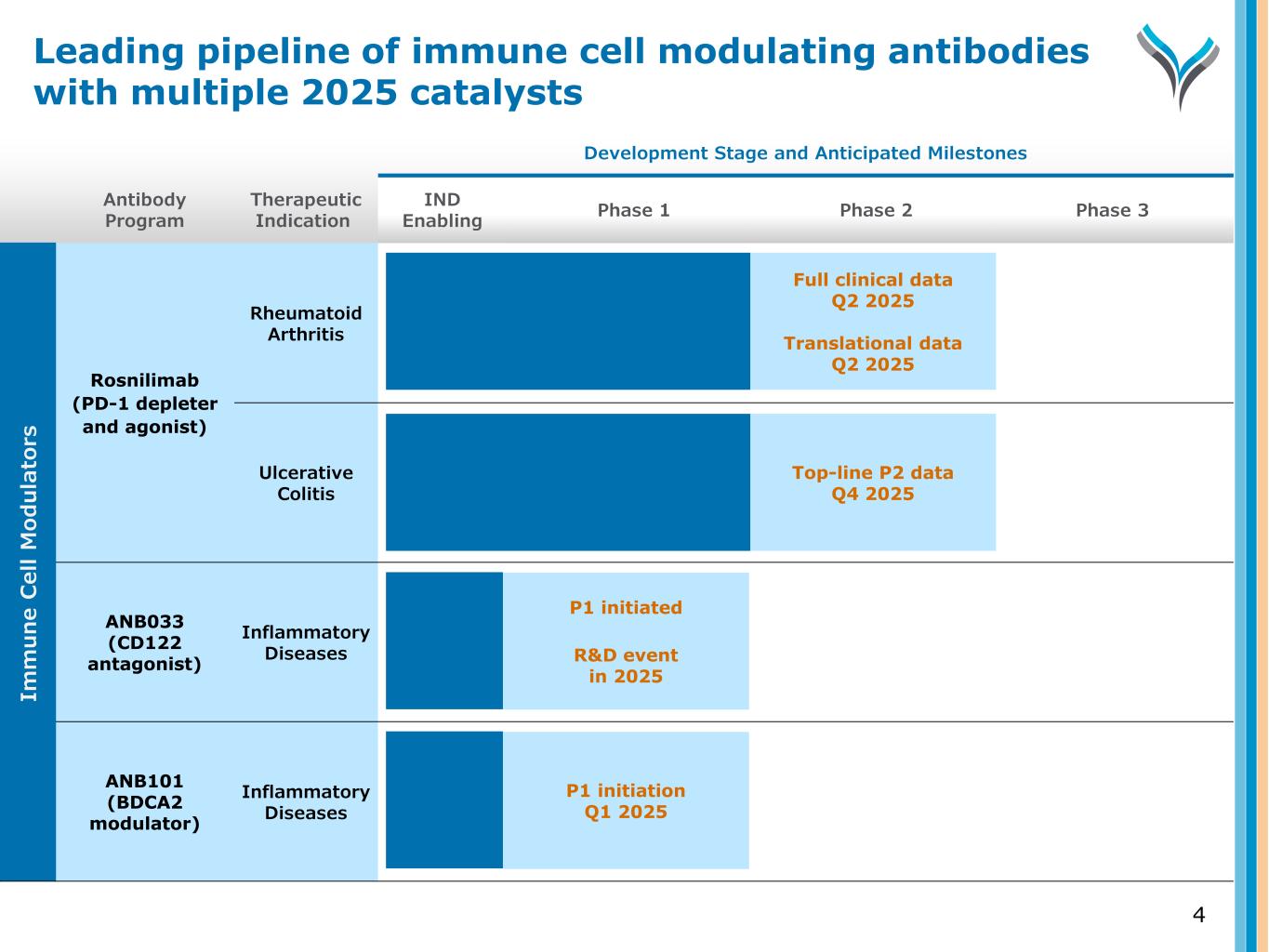 Cytokine Antagonists (available for out-license) 3 Immune Cell Modulators ANB033 (CD122 antagonist) P1 in Healthy Volunteers Rosnilimab (PD-1 depleter and agonist) P2b in Rheumatoid Arthritis P2 in Ulcerative Colitis Autoimmune and inflammatory diseases including dermatology, gastroenterology and rheumatology ANB101 (BDCA2 modulator) P1 (Q1 2025) in Healthy Volunteers Imsidolimab (IL-36R) Out-licensed to Etokimab (IL-33) P2b/3-ready in epithelial-driven diseases Research and Capital Strong capital position Research-driven • YE 2024 cash: ~$420MM • Expected cash runway: YE 2027 o Excludes GSK royalty and milestone potential for Jemperli and cobolimab o Excludes GSK $75MM milestone for Jemperli $1B annual WW sales • Preclinical pipeline of immunology targets Best-in-class immune cell modulating antibodies