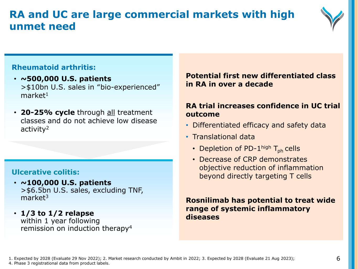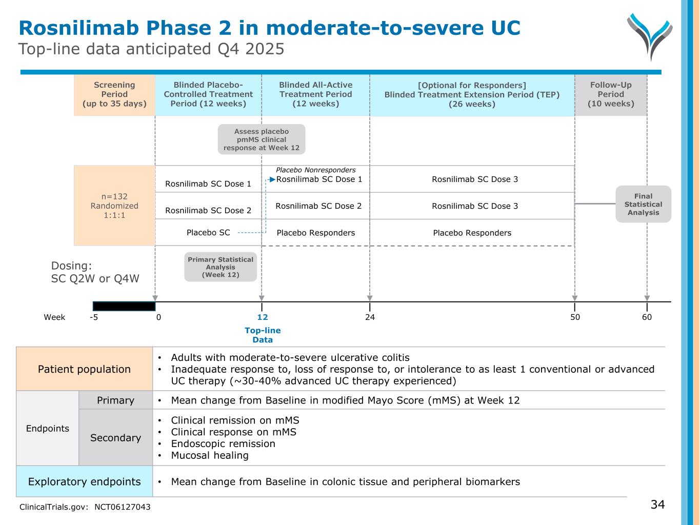 [Optional for Responders] Blinded Treatment Extension Period (TEP) (26 weeks) Rosnilimab Phase 2 in moderate-to-severe UC Top-line data anticipated Q4 2025 Screening Period (up to 35 days) Blinded Placebo- Controlled Treatment Period (12 weeks) Follow-Up Period (10 weeks) Blinded All-Active Treatment Period (12 weeks) Week -5 0 12 24 Rosnilimab SC Dose 1 Rosnilimab SC Dose 2 Placebo SC Rosnilimab SC Dose 1 Rosnilimab SC Dose 2 Placebo Responders n=132 Randomized 1:1:1 Final Statistical Analysis Dosing: SC Q2W or Q4W Top-line Data Patient population • Adults with moderate-to-severe ulcerative colitis • Inadequate response to, loss of response to, or intolerance to as least 1 conventional or advanced UC therapy (~30-40% advanced UC therapy experienced) Endpoints Primary • Mean change from Baseline in modified Mayo Score (mMS) at Week 12 Secondary • Clinical remission on mMS • Clinical response on mMS • Endoscopic remission • Mucosal healing Exploratory endpoints • Mean change from Baseline in colonic tissue and peripheral biomarkers ClinicalTrials.gov: NCT06127043 Rosnilimab SC Dose 3 Rosnilimab SC Dose 3 Placebo Responders 50 60 34 Placebo Nonresponders Primary Statistical Analysis (Week 12) Assess placebo pmMS clinical response at Week 12