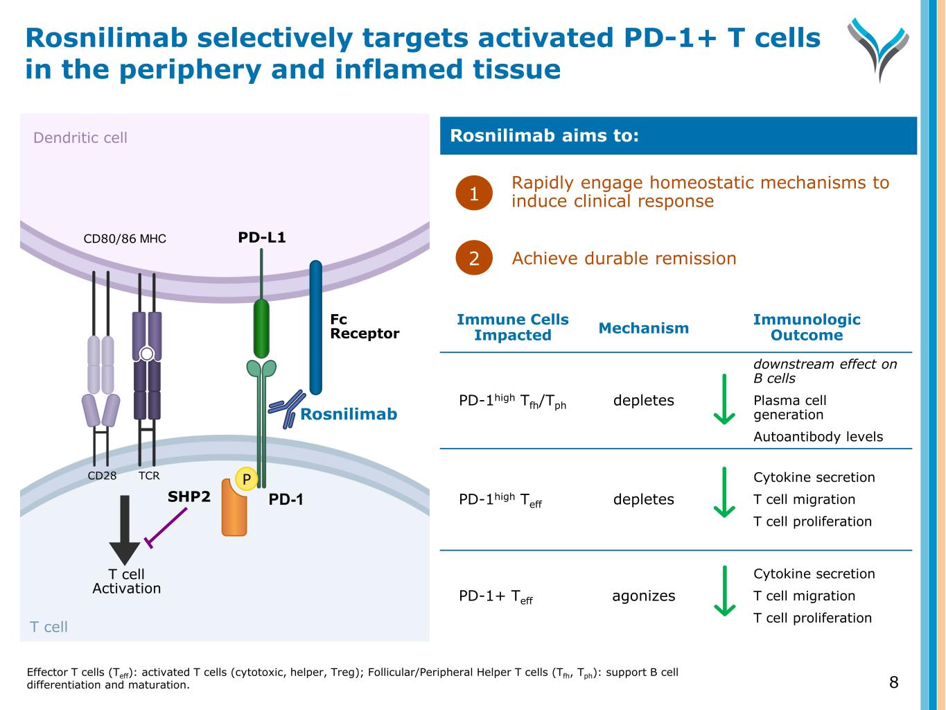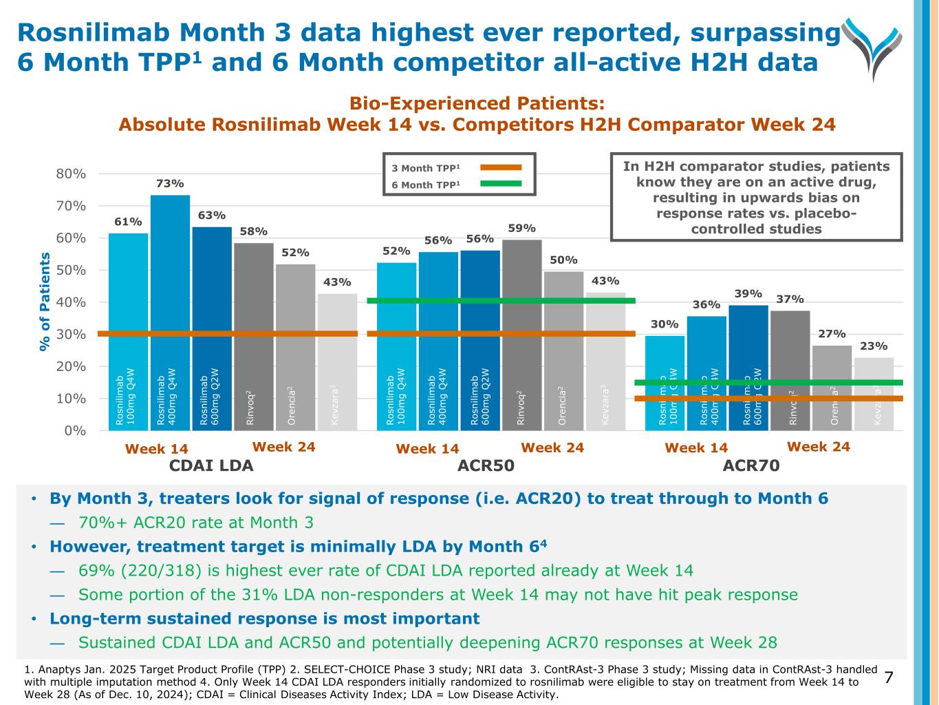 • By Month 3, treaters look for signal of response (i.e. ACR20) to treat through to Month 6 ― 70%+ ACR20 rate at Month 3 • However, treatment target is minimally LDA by Month 64 ― 69% (220/318) is highest ever rate of CDAI LDA reported already at Week 14 ― Some portion of the 31% LDA non-responders at Week 14 may not have hit peak response • Long-term sustained response is most important ― Sustained CDAI LDA and ACR50 and potentially deepening ACR70 responses at Week 28 7 61% 52% 30% 73% 56% 36% 63% 56% 39% 58% 59% 37% 52% 50% 27% 43% 43% 23% 0% 10% 20% 30% 40% 50% 60% 70% 80% % o f P a ti e n ts Bio-Experienced Patients: Absolute Rosnilimab Week 14 vs. Competitors H2H Comparator Week 24 Week 14 Week 24 Week 14 Week 24 Week 14 Week 24 CDAI LDA ACR50 ACR70 1. Anaptys Jan. 2025 Target Product Profile (TPP) 2. SELECT-CHOICE Phase 3 study; NRI data 3. ContRAst-3 Phase 3 study; Missing data in ContRAst-3 handled with multiple imputation method 4. Only Week 14 CDAI LDA responders initially randomized to rosnilimab were eligible to stay on treatment from Week 14 to Week 28 (As of Dec. 10, 2024); CDAI = Clinical Diseases Activity Index; LDA = Low Disease Activity. Rosnilimab Month 3 data highest ever reported, surpassing 6 Month TPP1 and 6 Month competitor all-active H2H data In H2H comparator studies, patients know they are on an active drug, resulting in upwards bias on response rates vs. placebo- controlled studies R os ni lim ab 10 0m g Q 4W R os ni lim ab 40 0m g Q 4W R os ni lim ab 60 0m g Q 2W R in vo q2 O re nc ia 2 K ev za ra 3 6 Month TPP1 3 Month TPP1 R os ni lim ab 10 0m g Q 4W R os ni lim ab 40 0m g Q 4W R os ni lim ab 60 0m g Q 2W R in vo q2 O re nc ia 2 K ev za ra 3 R os ni lim ab 10 0m g Q 4W R os ni lim ab 40 0m g Q 4W R os ni lim ab 60 0m g Q 2W R in vo q2 O re nc ia 2 K ev za ra 3
