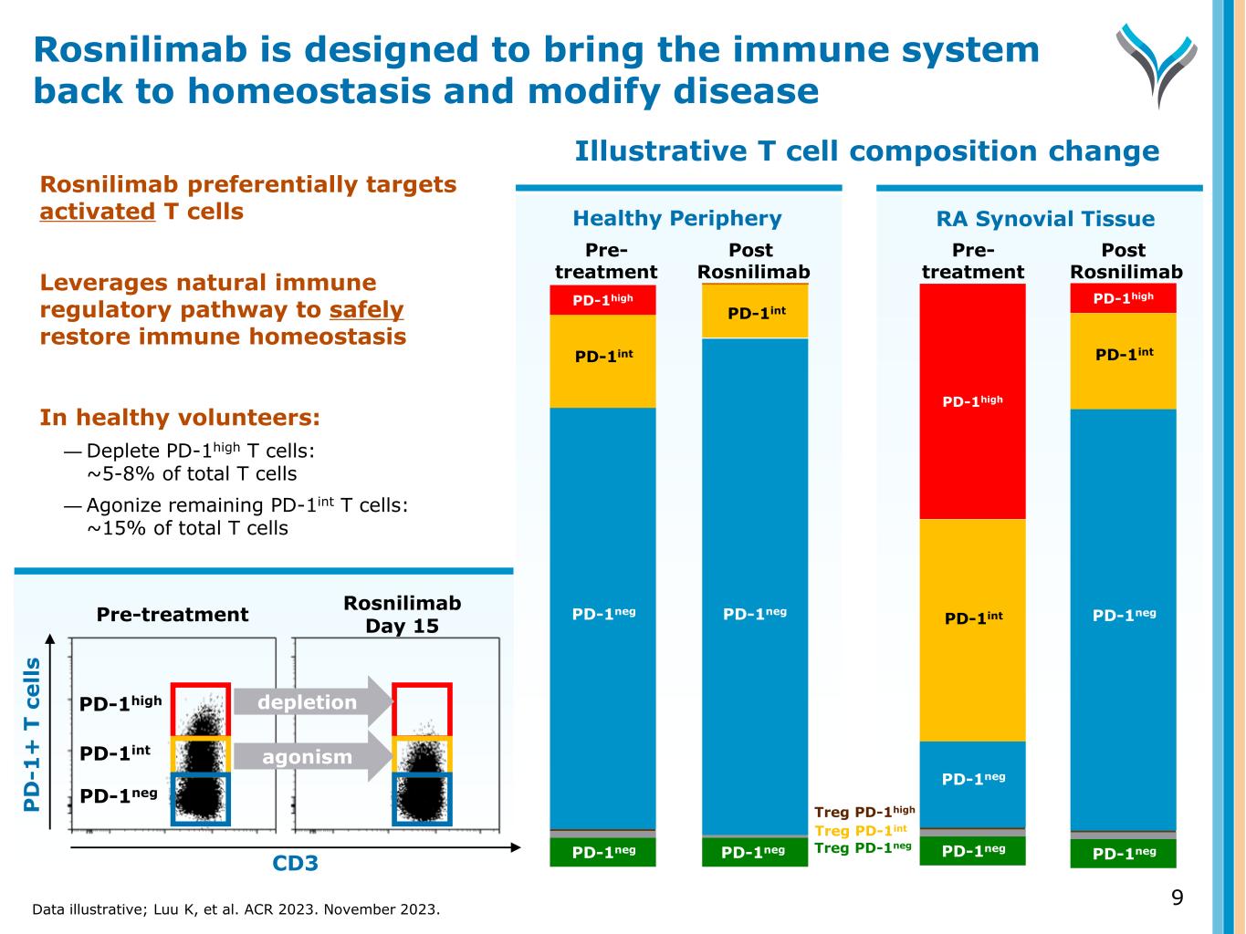 8 Dendritic cell T cell T cell Activation MHCCD80/86 SHP2 TCRCD28 P PD-1 PD-L1 Rosnilimab Fc Receptor Rapidly engage homeostatic mechanisms to induce clinical response1 2 Rosnilimab aims to: Immune Cells Impacted Mechanism Immunologic Outcome PD-1high Tfh/Tph depletes downstream effect on B cells Plasma cell generation Autoantibody levels PD-1high Teff depletes Cytokine secretion T cell migration T cell proliferation PD-1+ Teff agonizes Cytokine secretion T cell migration T cell proliferation Achieve durable remission Rosnilimab selectively targets activated PD-1+ T cells in the periphery and inflamed tissue Effector T cells (Teff): activated T cells (cytotoxic, helper, Treg); Follicular/Peripheral Helper T cells (Tfh, Tph): support B cell differentiation and maturation.