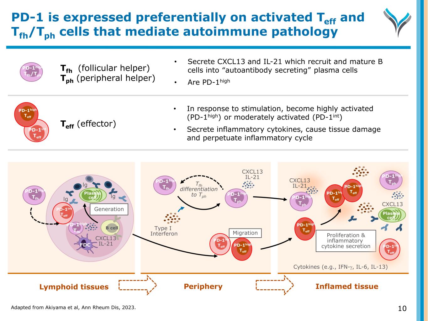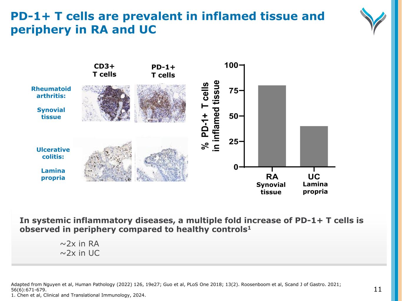 Adapted from Akiyama et al, Ann Rheum Dis, 2023. 10 PD-1 is expressed preferentially on activated Teff and Tfh/Tph cells that mediate autoimmune pathology Lymphoid tissues Periphery Inflamed tissue 10 B cell PD-1high Tfh Plasma celllg lg lg PD-1high Tfh FDC Generation CXCL13 IL-21 PD-1high Tfh Type I Interferon CXCL13 IL-21 Proliferation & inflammatory cytokine secretion Cytokines (e.g., IFN-γ, IL-6, IL-13) CXCL13 IL-21 CXCL13 Plasma cell Tfh (follicular helper) Tph (peripheral helper) • In response to stimulation, become highly activated (PD-1high) or moderately activated (PD-1int) • Secrete inflammatory cytokines, cause tissue damage and perpetuate inflammatory cycle PD-1high Tfh/Tph • Secrete CXCL13 and IL-21 which recruit and mature B cells into “autoantibody secreting” plasma cells • Are PD-1high Teff (effector) Migration Tfh differentiation to Tph PD-1high Tph PD-1high Tph PD-1high Tph PD-1int Teff PD-1int Teff PD-1high Teff PD-1high Teff PD-1high Teff PD-1high Teff PD-1int Teff PD-1int Teff PD-1high Teff